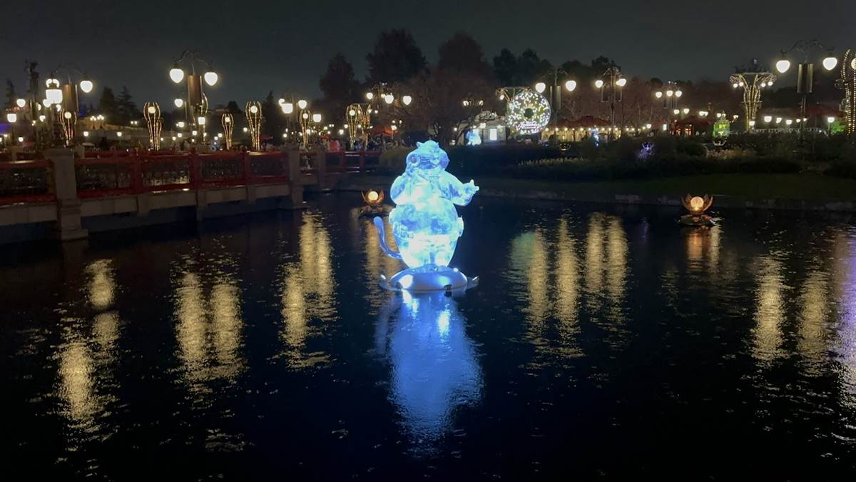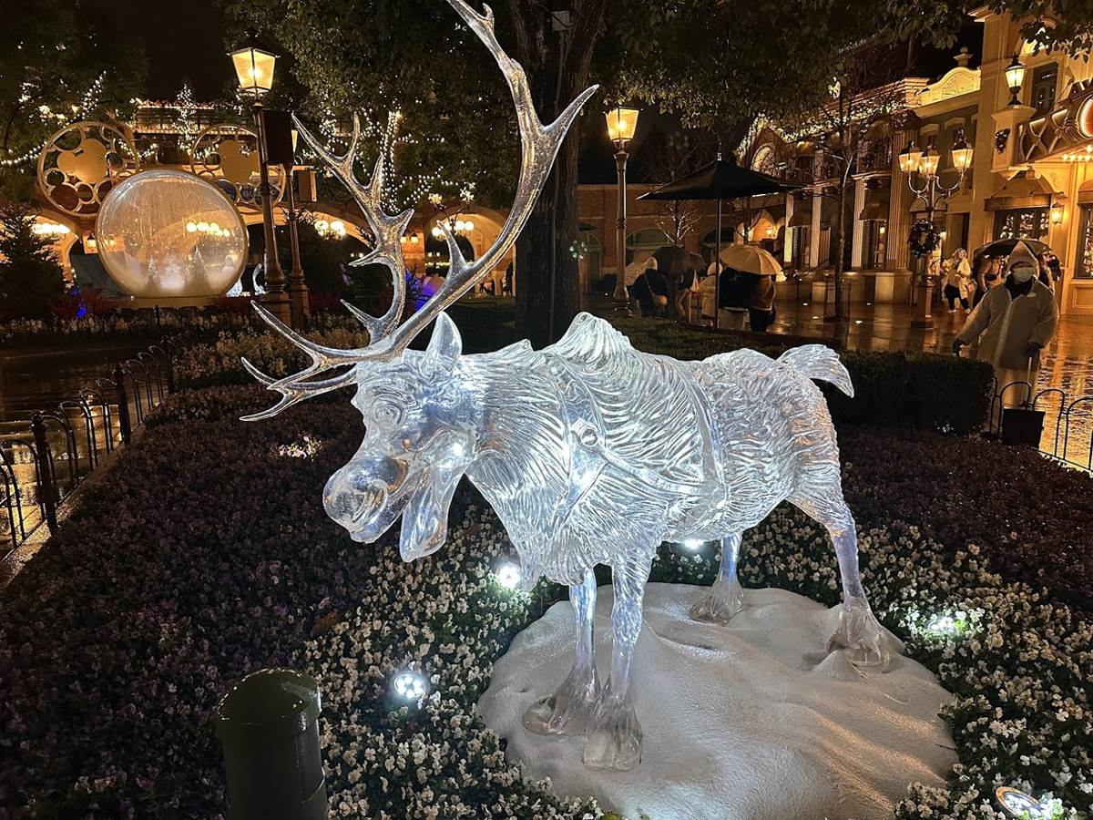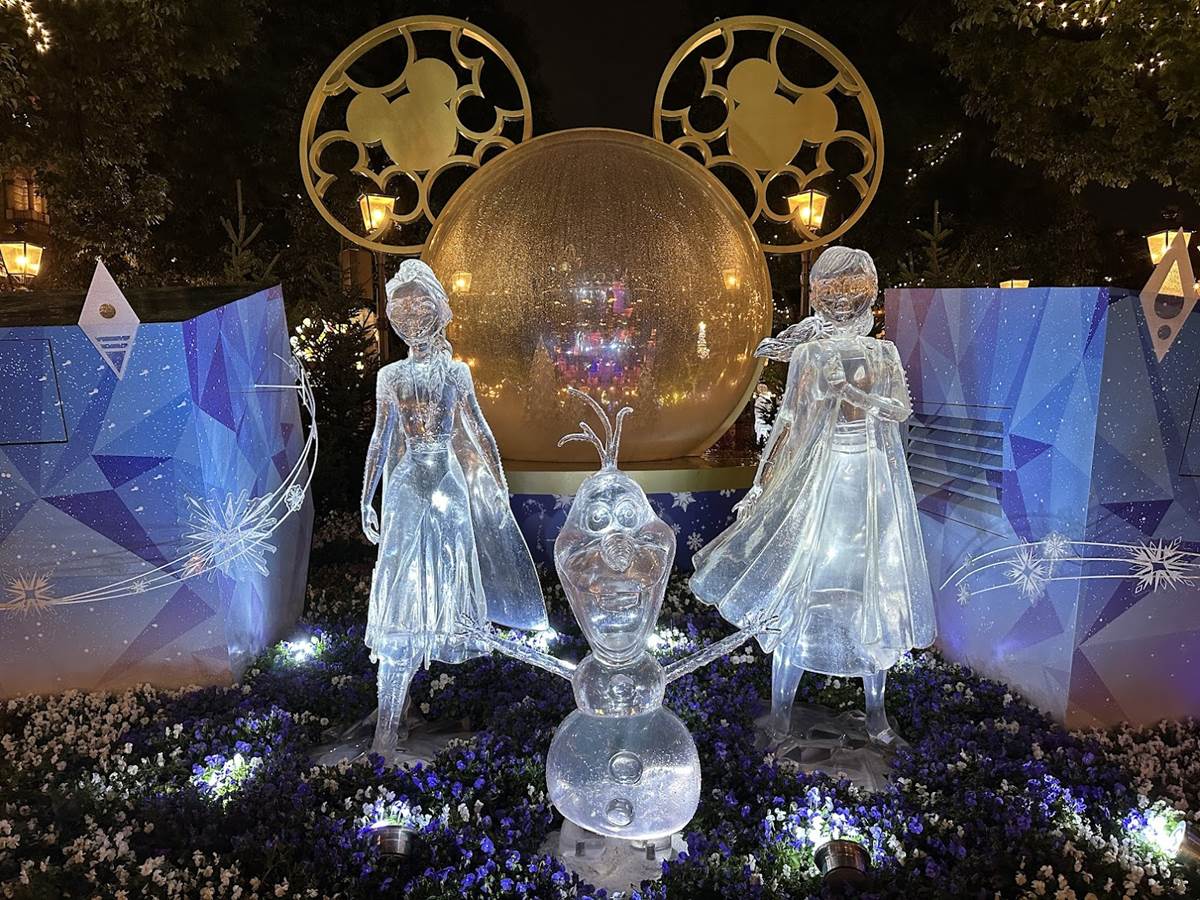 Characters from Zootopia, Frozen, and more are replicated in ice sculpture-like statues around the park as part of Shanghai Disneyland’s yearly holiday decorations, glowing beautifully at night.