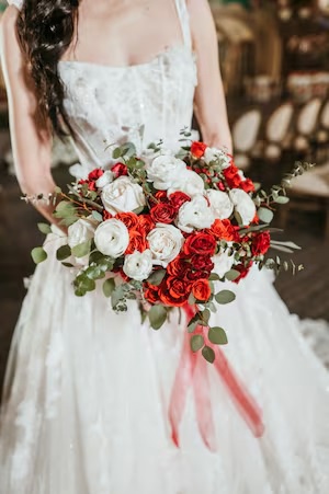- Combining a classic and elegant look with a bold twist, the ivory gown features intricate 3D floral appliqués as well as a removable red cape.