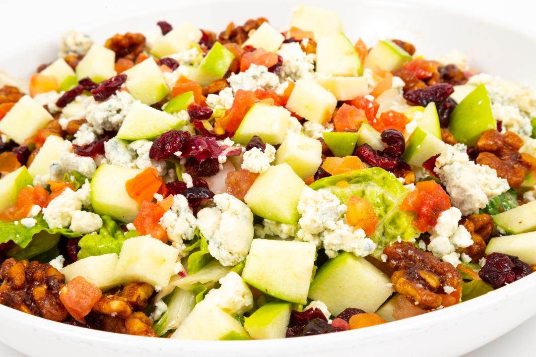 - Crisp Granny Smith apple chunks, spiced walnuts, Gorgonzola, tomatoes, and dried cranberries are topped with our signature Italian vinaigrette.