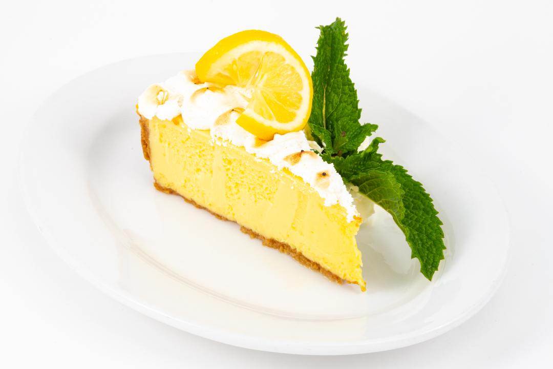 - Homemade lemon meringue on graham cracker crust topped with whipped cream, dollops of toasted meringue & a lemon wheel.