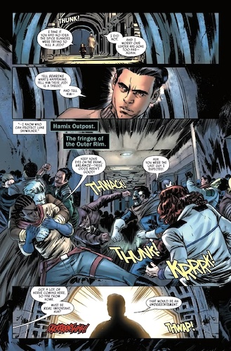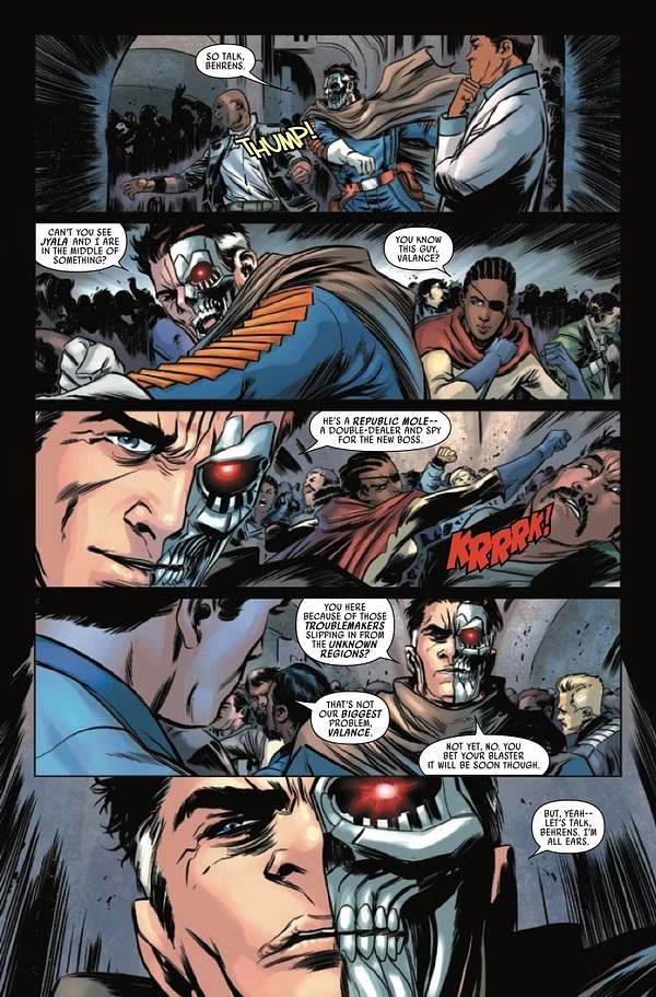 The Battle of Jakku - Republic Under Siege #3 begins on the planet Kijimi, where the character named Tomasso (who first appeared in the 2020 young-adult novel Star Wars: Poe Dameron - Free Fall by author Alex Segura, who also wrote this comic) meets with Zeva, the current leader of the Spice Runners. Tomasso brings in a contact with some information he believes Zeva will find interesting, and it turns out to be none other than the freedom-fighter Weazel, Warwick Davis’s character from Star Wars: Episode I - The Phantom Menace and Solo: A Star Wars Story. Weazel informs Zeva that Adelhard has hired deadly bounty hunters to kill Luke Skywalker, but Zeva dismisses him, claiming that it was indeed the Spice Runners of Kijimi who “own" that contract. Still, Zeva remains wary of Adelhard’s growing influence in the galaxy, and we cut to a location called Hamix Outpost (newly introduced here), where Republic spy Calder Behrens meets with bounty hunter Beilert Valance (whose ongoing comic title Star Wars: Bounty Hunters ended at the beginning of this year) about pressing matters of galactic importance.