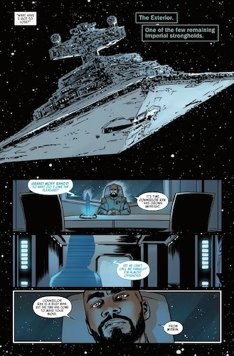 Next we find ourselves in a far-flung sector of the galaxy called the Exterior, where Grand Moff Randd holds a holo-conference with an unknown caller, suggesting that they “make their move" from the inside of Adelhard’s fleet, despite the fact that the rogue Imperial officer already suspects there to be a traitor in his midst. On Chandrila, a suddenly very pregnant (with Ben Solo, presumably) Princess Leia Organa meets with her twin brother Luke Skywalker and New Republic Chancellor Mon Mothma, when they are ambushed by an unnamed Trandoshan bounty hunter. The assassination attempt fails, but leaves Mothma injured and the other shaken, with the assailant refusing to say by whom he's been hired. Then in the Anoat sector, we see Reyna Oskure from the Acolytes of the Beyond pretending (?) to stage an assassination attempt on Grand Moff Adelhard, but this encounter just concludes with them making out again, though Adelhard still believes everyone is out to get him, and probably rightly so.