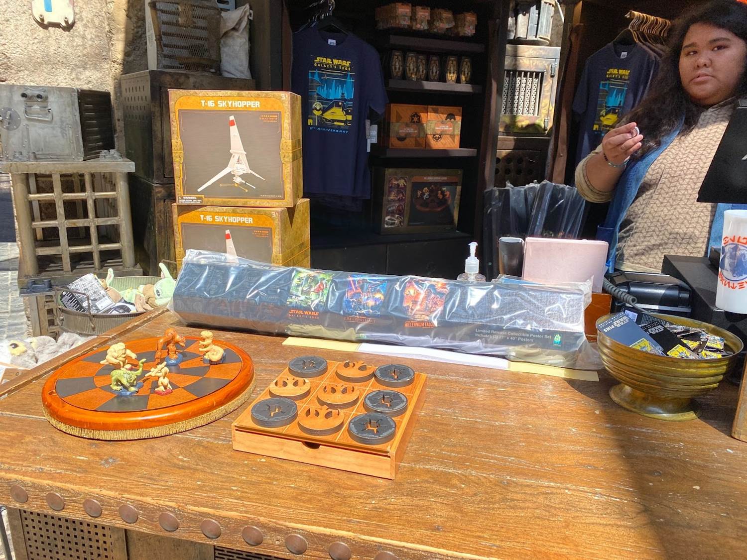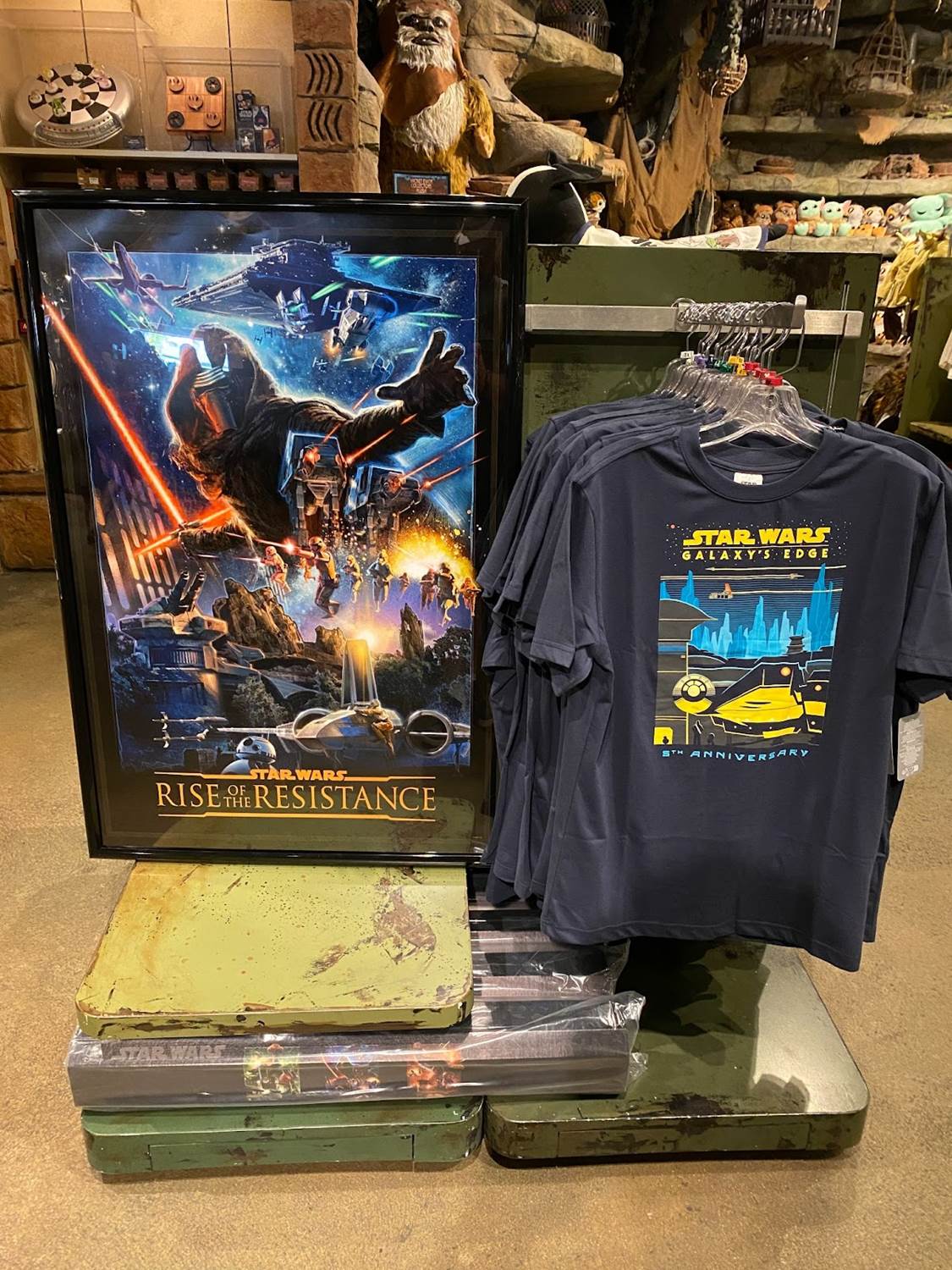 On the way into the park I stopped by the Star Wars Trading Post in the Downtown Disney District, and found special Star Wars: Galaxy’s Edge fifth anniversary merchandise available for sale. There was a unique three-poster set (featuring the attraction posters for Star Wars: Rise of the Resistance, Millennium Falcon: Smugglers Run, and Galaxy’s Edge itself), a t-shirt, and a pin with new art celebrating five years of Galaxy’s Edge.