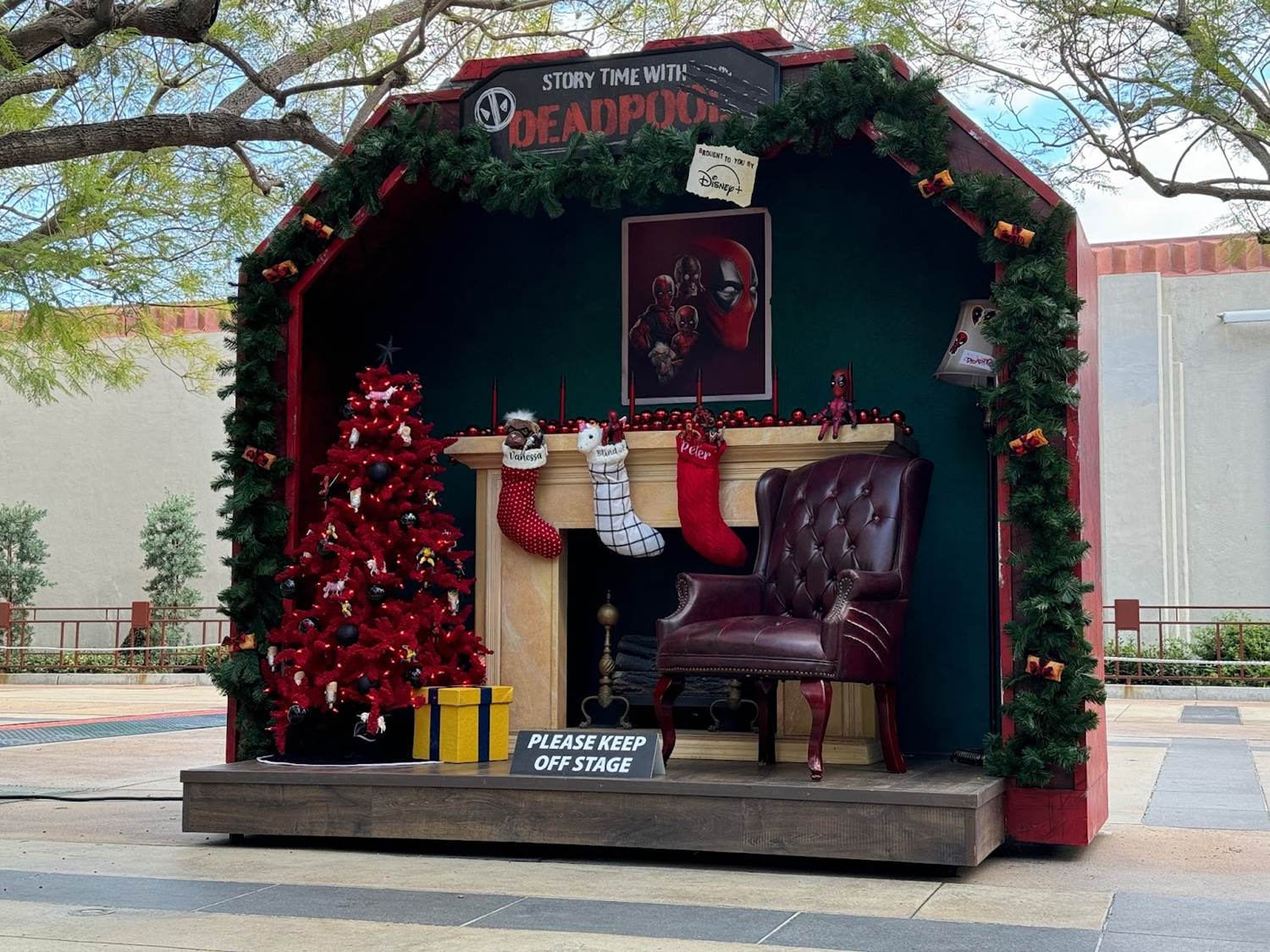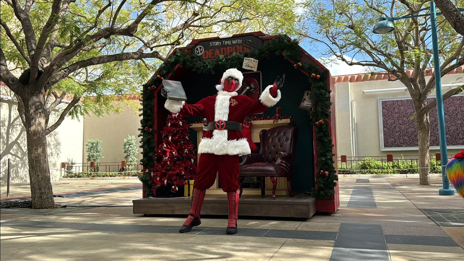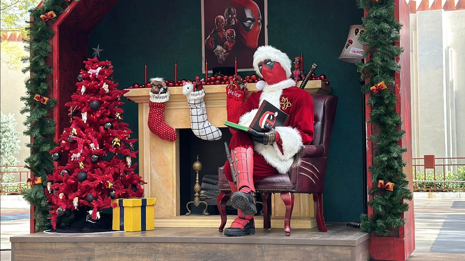Deadpool dresses up as Santa Claus, giving a festive twist to the Disney California Adventure show.