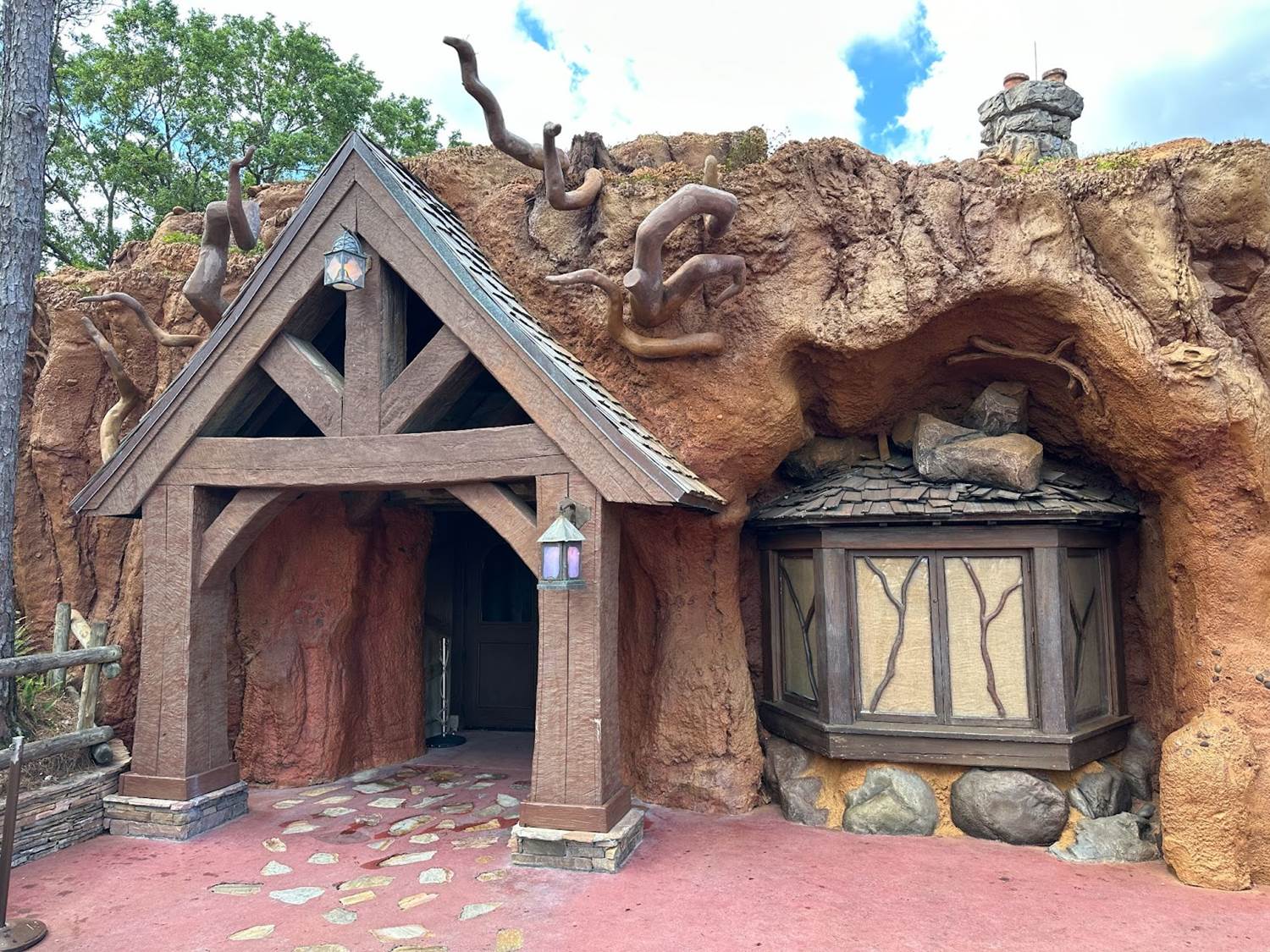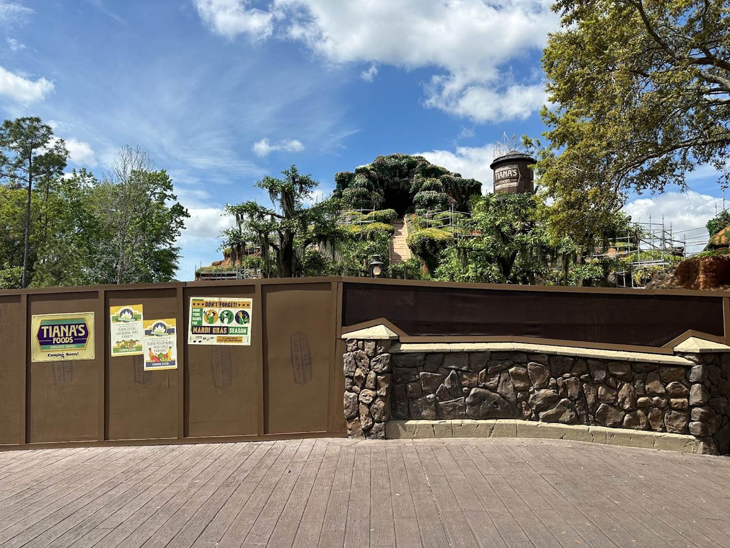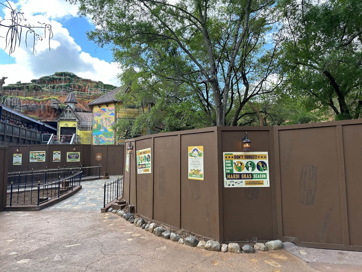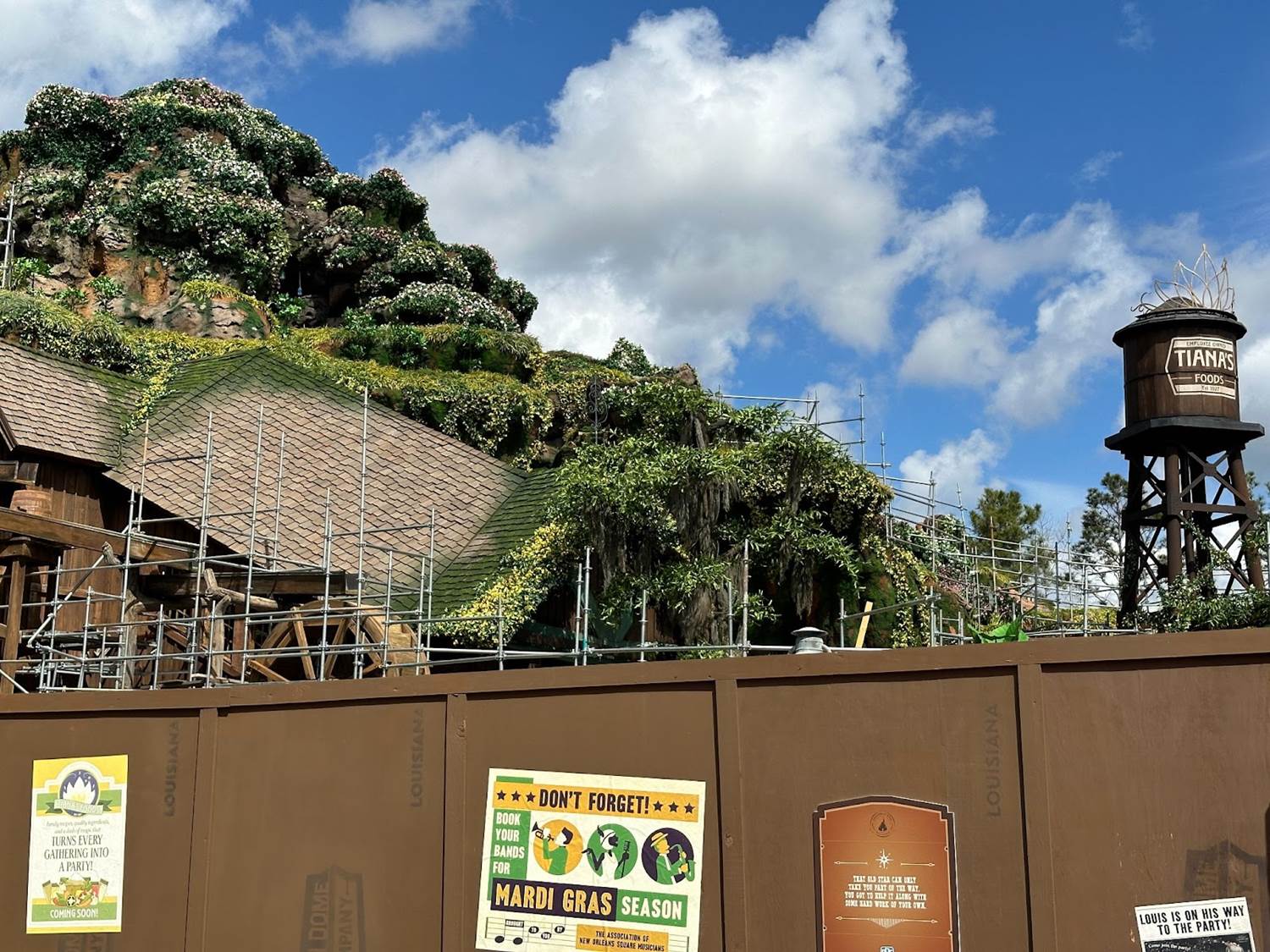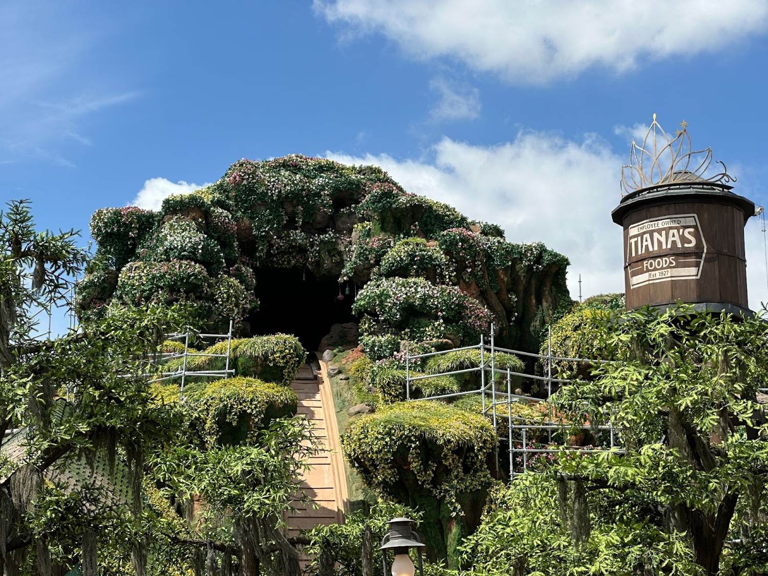 From the surrounding area of the attraction, guests can see a now completely covered hill with minimal scaffolding still in place. The greenery and flowers have engulfed the hill, giving it a beautiful bayou look.