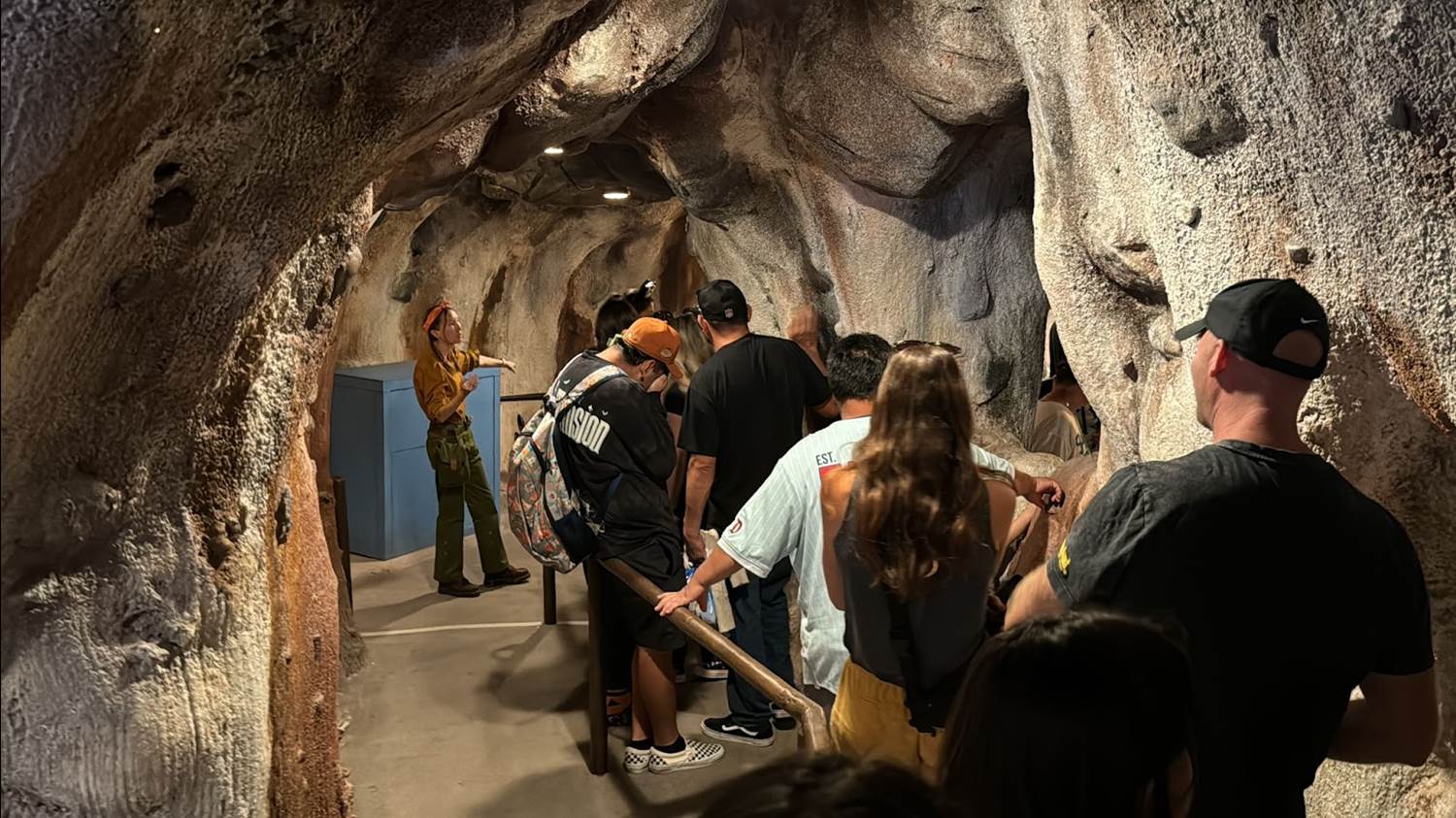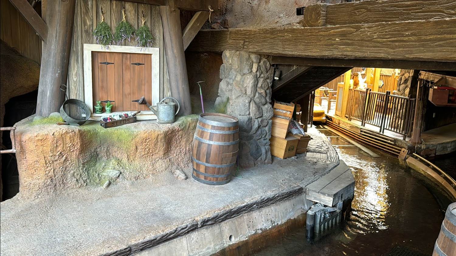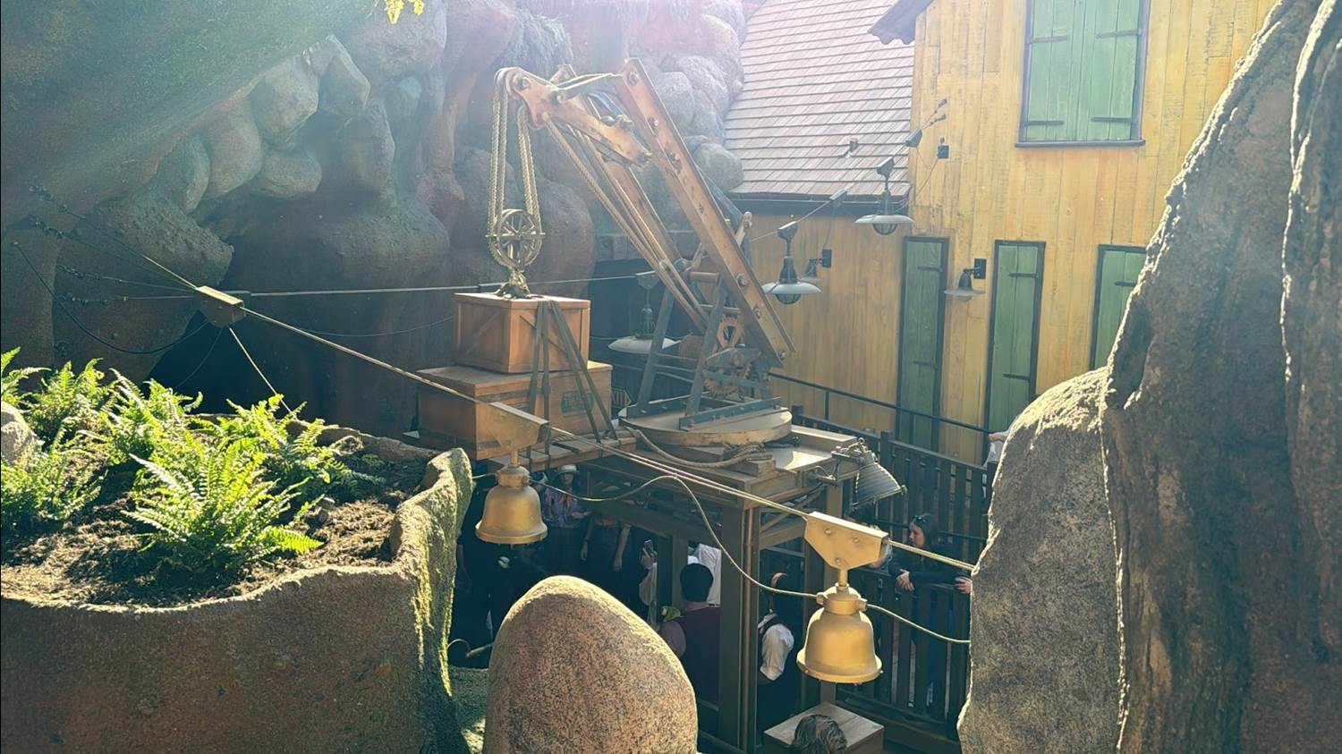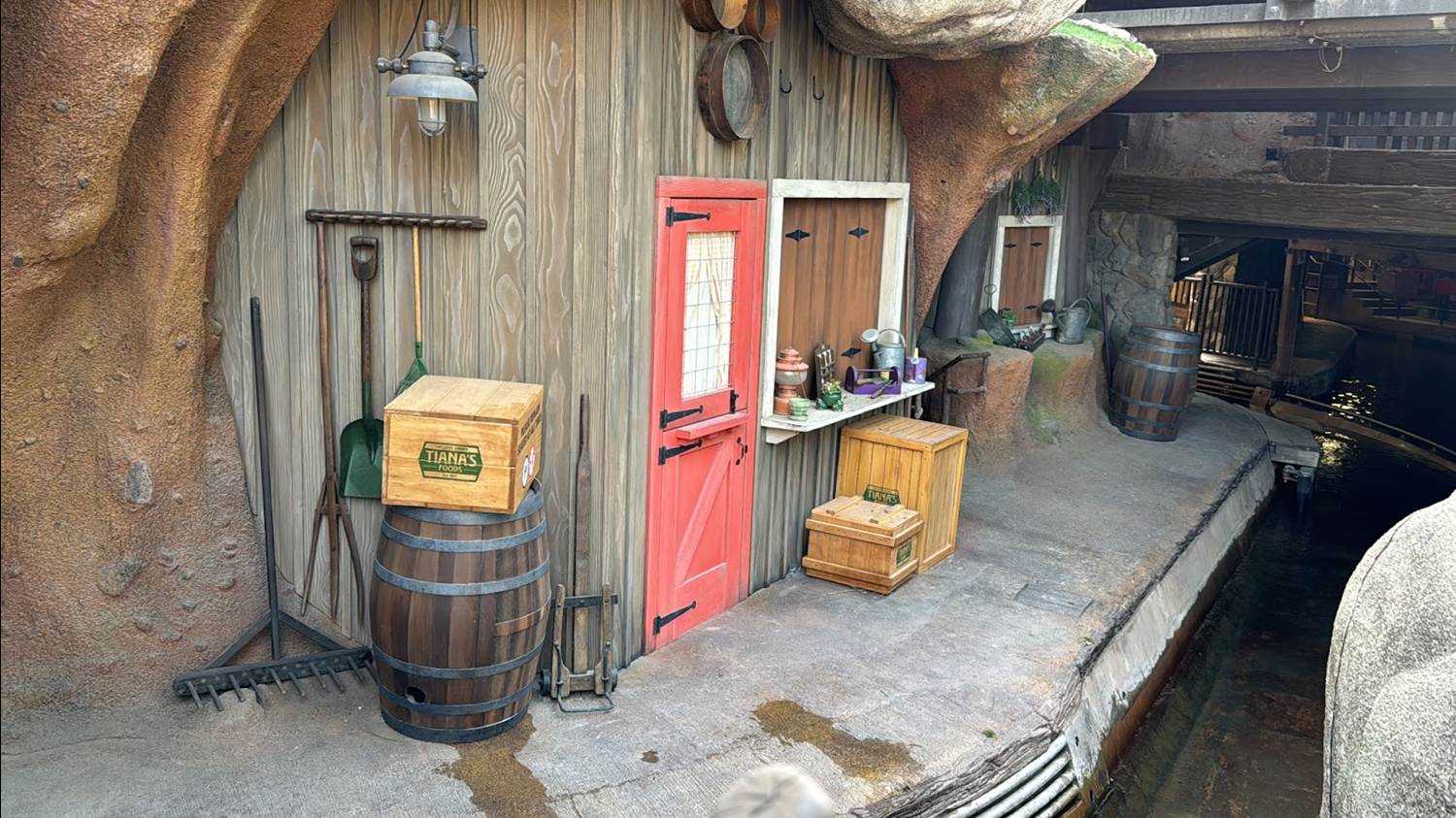 - Moving through the caves, guests will get a view at the attraction's loading area, which features delivery cranes for all of Tiana’s delicious products. As guests get closer to the loading area, new warning signs can be seen on the rock walls.