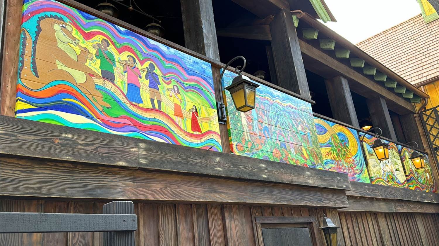 - Heading towards the main entrance to Tiana’s Foods, the upper level of the attraction’s queue is decorated with New Orleans-inspired murals.