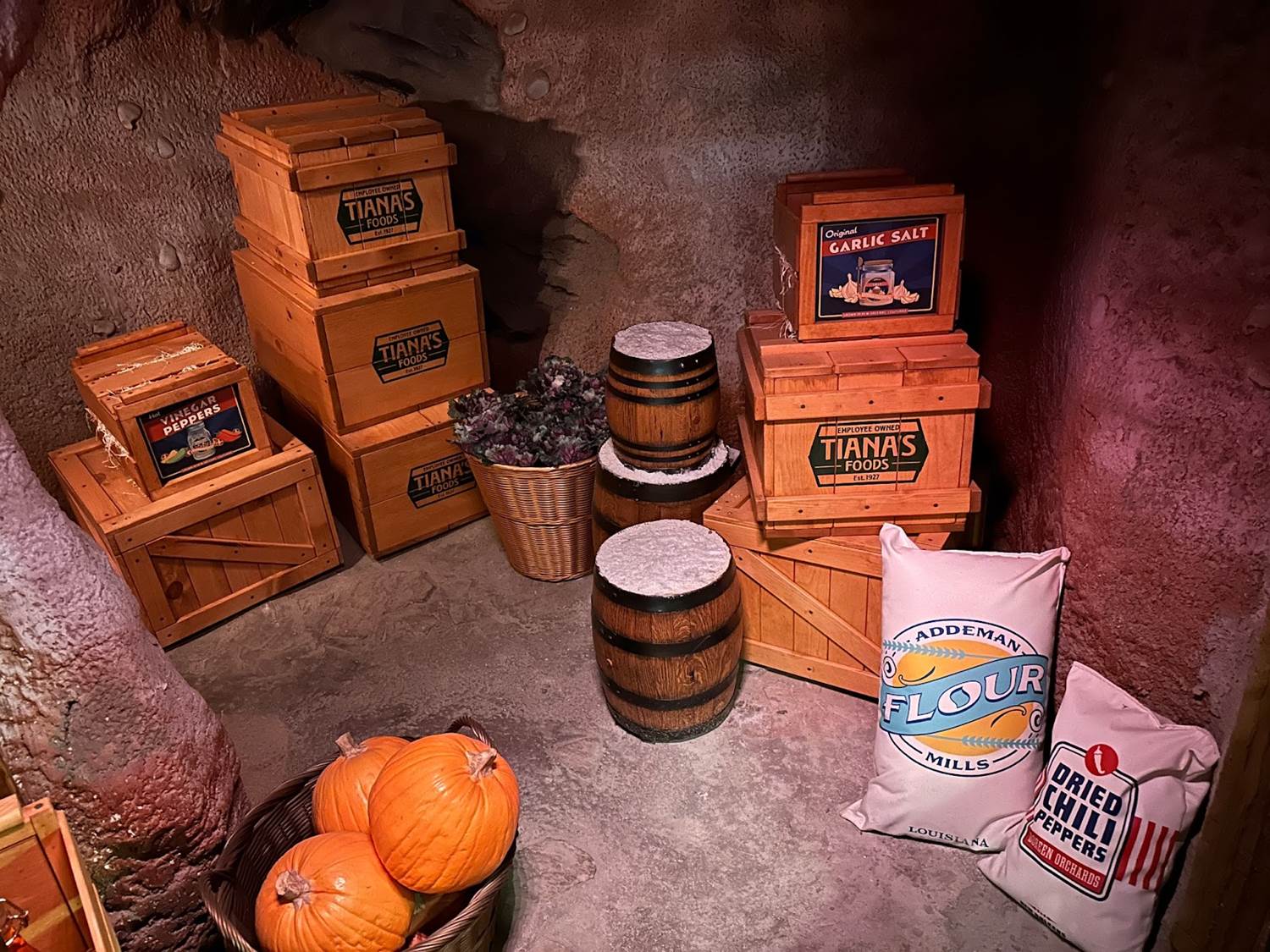 Plenty of boxes and barrels containing supplies for Tiana’s Foods can be found in this part of the queue as well.