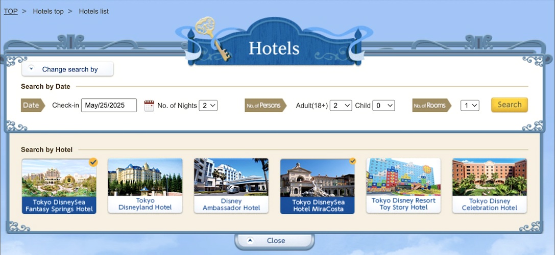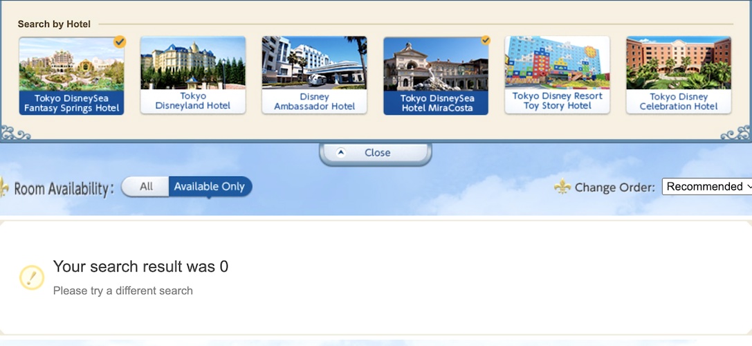 The first few times I tried my hand at booking a hotel, I clicked my desired room and was given an error message that my room type was no longer available. Unfortunately, at that point, your backup will most likely be gone as well. This goes specifically for Tokyo DisneySea’s MiraCosta and Fantasy Springs Hotels, as they are, by far, the most popular choices for booking. It is easiest to unselect the hotels at the top of the page you are uninterested in.