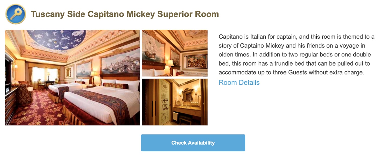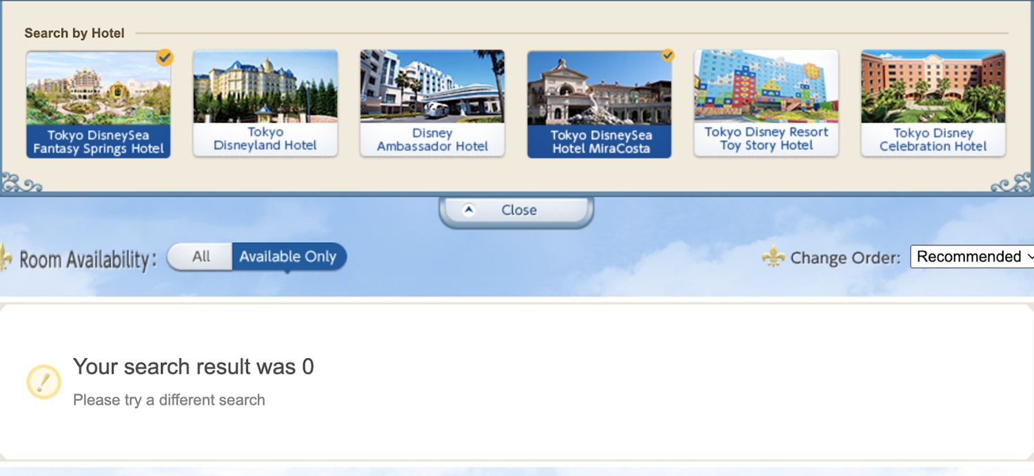 The first few times I tried my hand at booking a hotel, I clicked my desired room and was given an error message that my room type was no longer available. Unfortunately, at that point, your backup will most likely be gone as well. This goes specifically for Tokyo DisneySea’s MiraCosta and Fantasy Springs Hotels, as they are, by far, the most popular choices for booking. It is easiest to unselect the hotels at the top of the page you are uninterested in.
