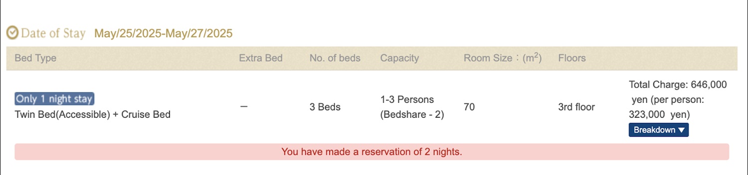 Essentially what that means is, the room you are booking is available on check in day, but not for an additional night during your stay. It will allow you to select it, but you’ll have to select a different room for the desired day that is unavailable. Tokyo Disney does offer free luggage transfer to your next hotel room when staying at different rooms and hotels. It was incredibly helpful for my trip, which saw us switch hotel rooms every single night due to availability issues.