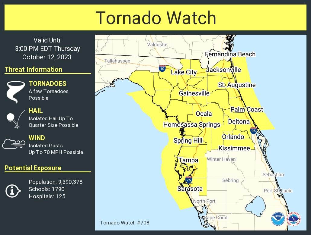 - There is a tornado watch issued by The National Weather Service in effect until 3 p.m. on October 12, 2023.