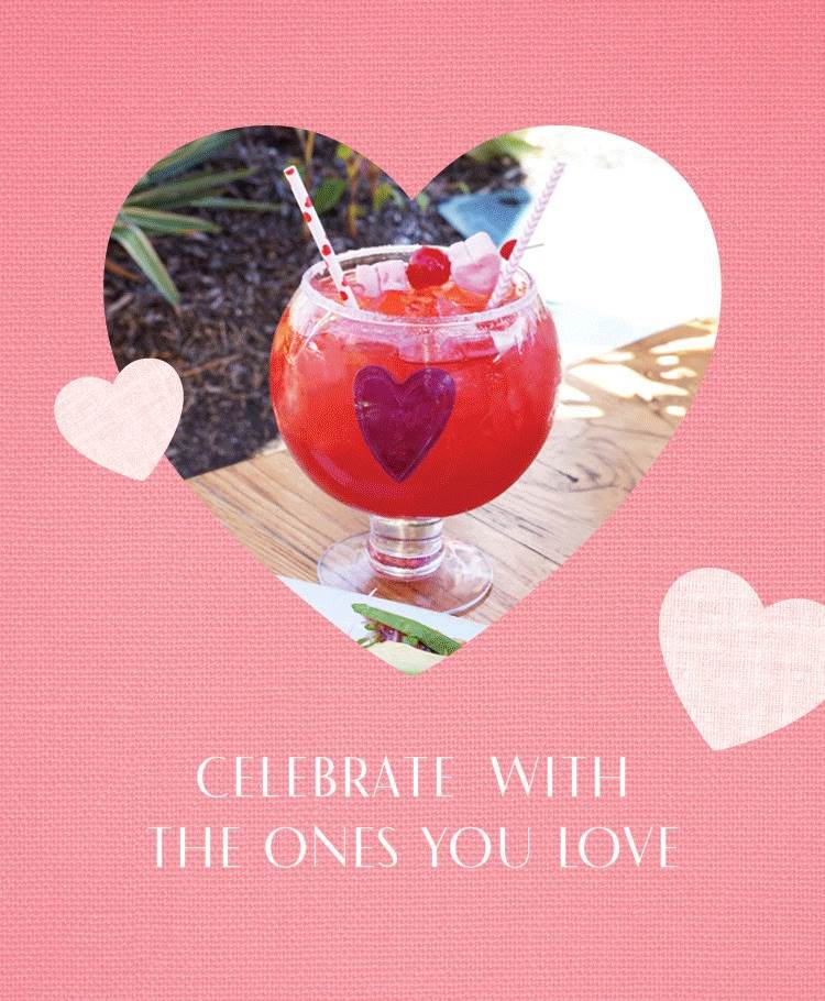 - Cupid's Corazon for Two – AsomBroso La Rosa tequila, pomegranate liqueur, organic margarita mix, cranberry juice garnished with sugar rim, marshmallows, candy hearts