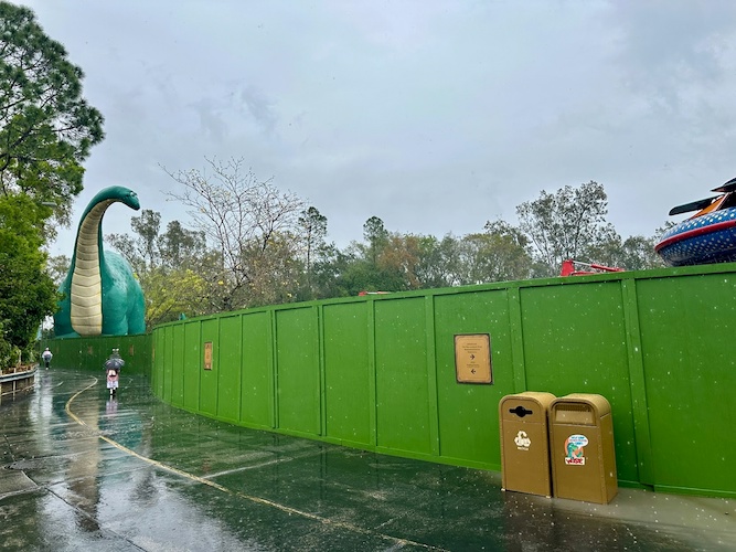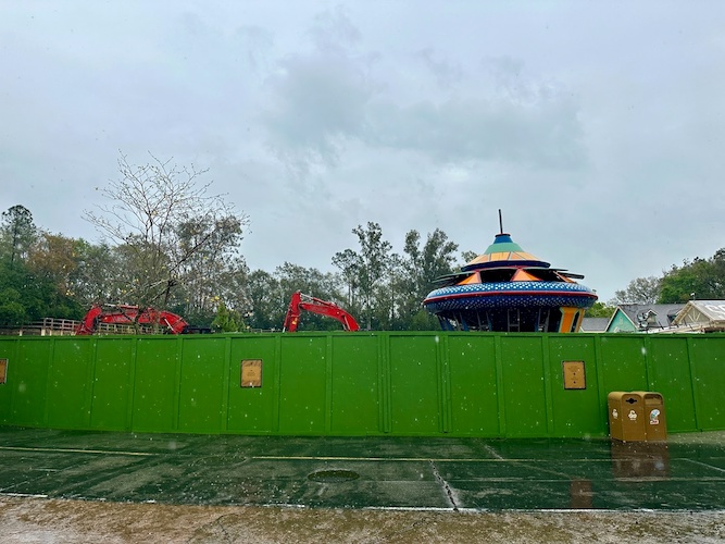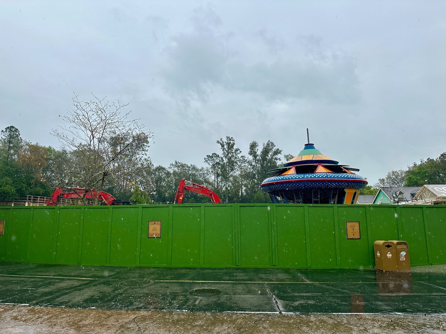 This morning, we made our way to a very rainy Disney’s Animal Kingdom to check on the latest construction progress in the former Chester & Hester’s Dino-Rama – and the deconstruction progress of TriceraTop Spin is in full swing.