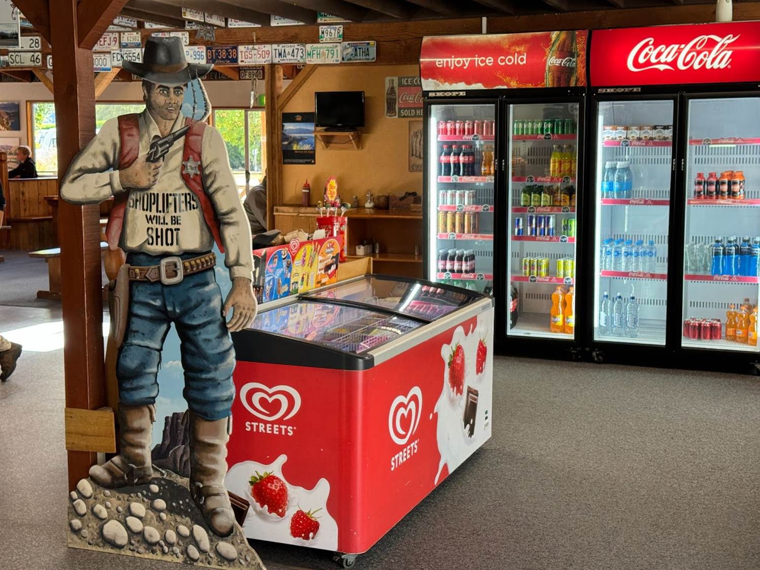 Our lunch stop was at the Makarora Country Cafe, which is sort of like a Cracker Barrel but with cafeteria-style ordering. The menu includes meat and vegetable pies, fish and chips, sandwiches, salads, and lots of dessert items, including ice cream. The interior is decorated with turn-of-the-century relics and license plates from all over the world.