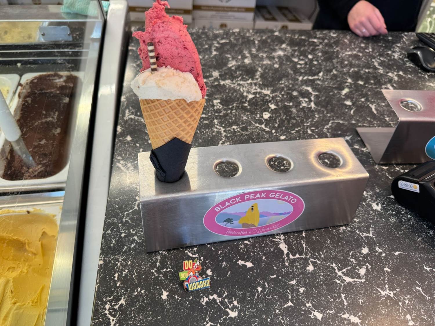 The town of Wanaka is picturesque, with lots of quaint shops and one of the best gelato shops in the country. Our Adventure Guides had been building up Black Peak Gelato as we made our way toward the town, but it became a must-do when they told us that ice cream was on Mickey Mouse. So, naturally, we made it our first stop. I got two scoops sourced from locally-grown fruits - Black Doris Plum and Feijoa. And what’s that on the counter?