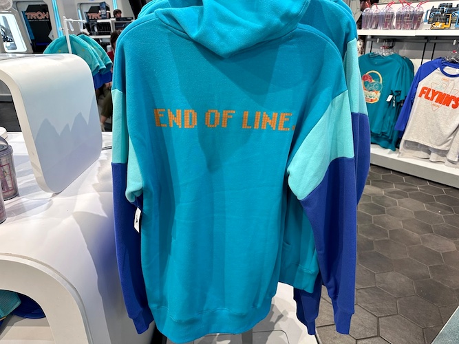 A hoodie, windbreaker, baseball cap and t-shirt all stand out with their bright blue, very 80s-inspired coloring. The hoodie also has a nice touch with the words “End of Line" on the back, a phrase familiar to any TRON fan.