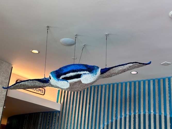 As you take in the stunning views of Seven Seas Lagoon, you'll be surrounded by stunning Polynesian-themed artwork, some made from recycled materials and fishing nets.