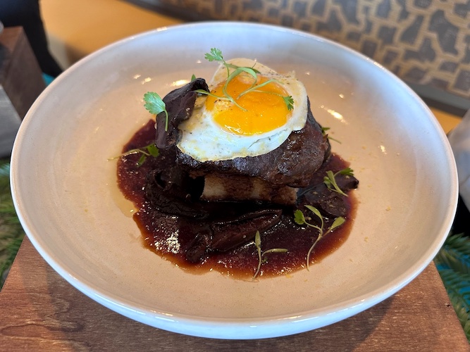 - Beef Short Rib Loco Moco: Shiitake mushroom gravy, crispy rice cake, and fried egg