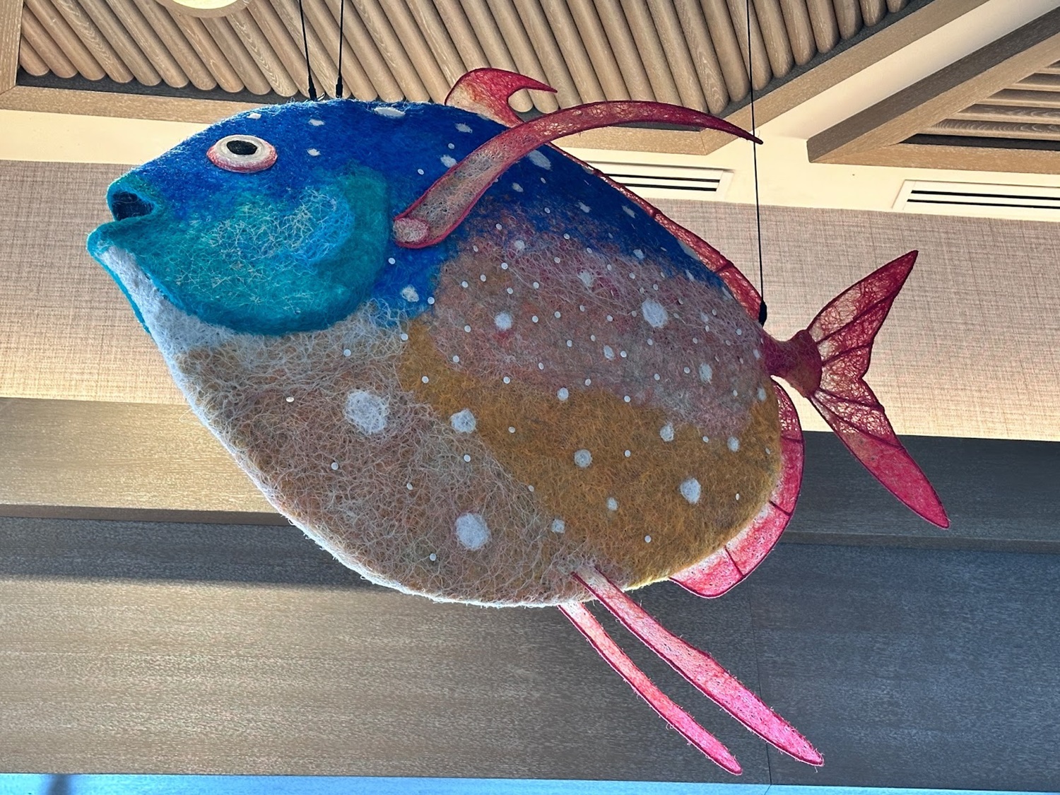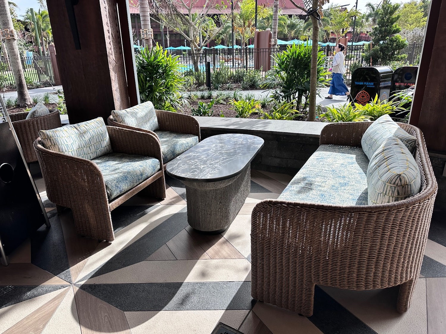 As you take in the stunning views of Seven Seas Lagoon, you'll be surrounded by stunning Polynesian-themed artwork, some made from recycled materials and fishing nets.