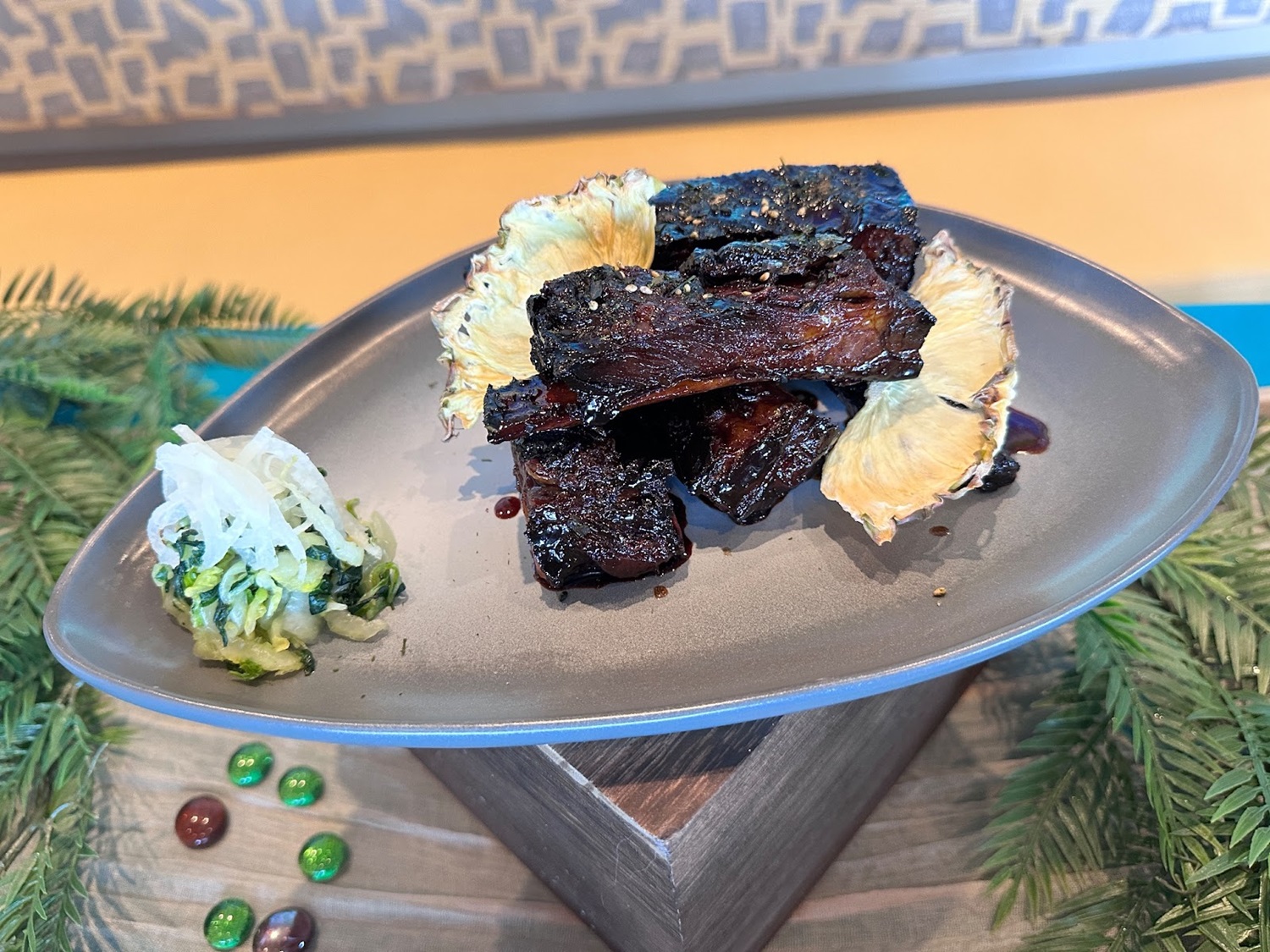 - Sticky Pork Ribs with salt-cured green cabbage, jicama slaw, and pineapple chips