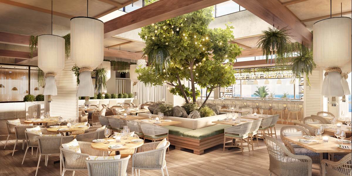- The space, which boasts three bars, an airy, natural light-filled dining room centered around a lush tree reaching toward a skylight, and greenery throughout, was designed in collaboration with renowned architecture and design firm Rockwell Group.