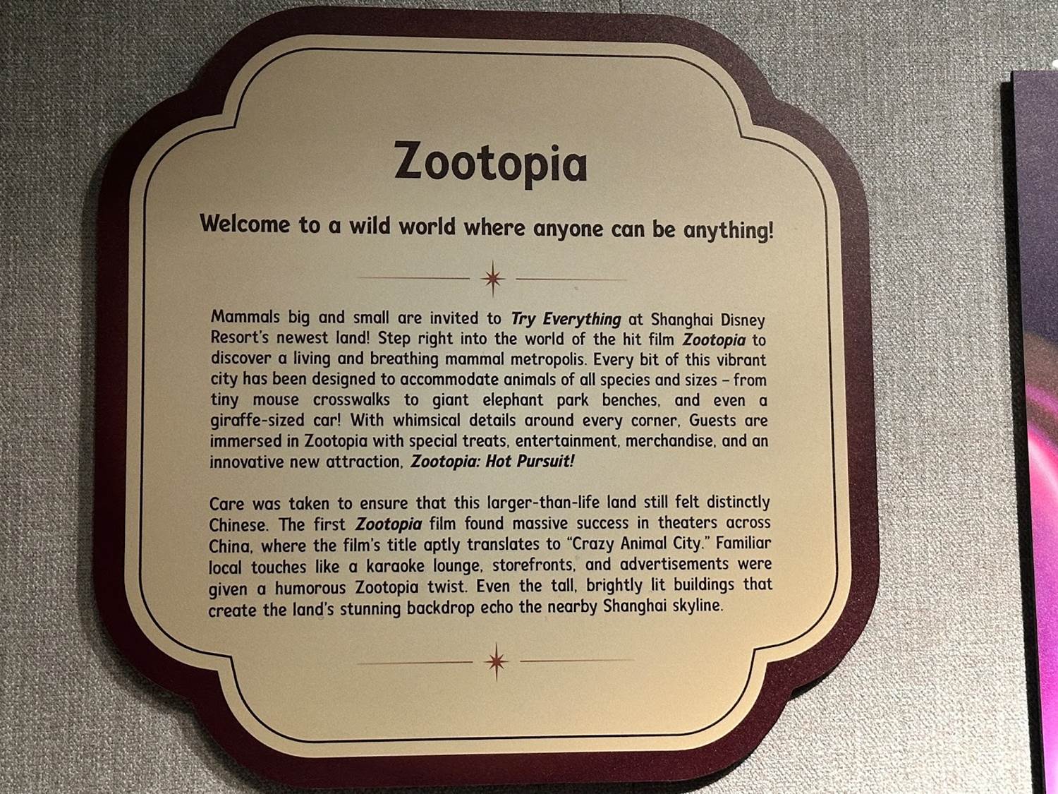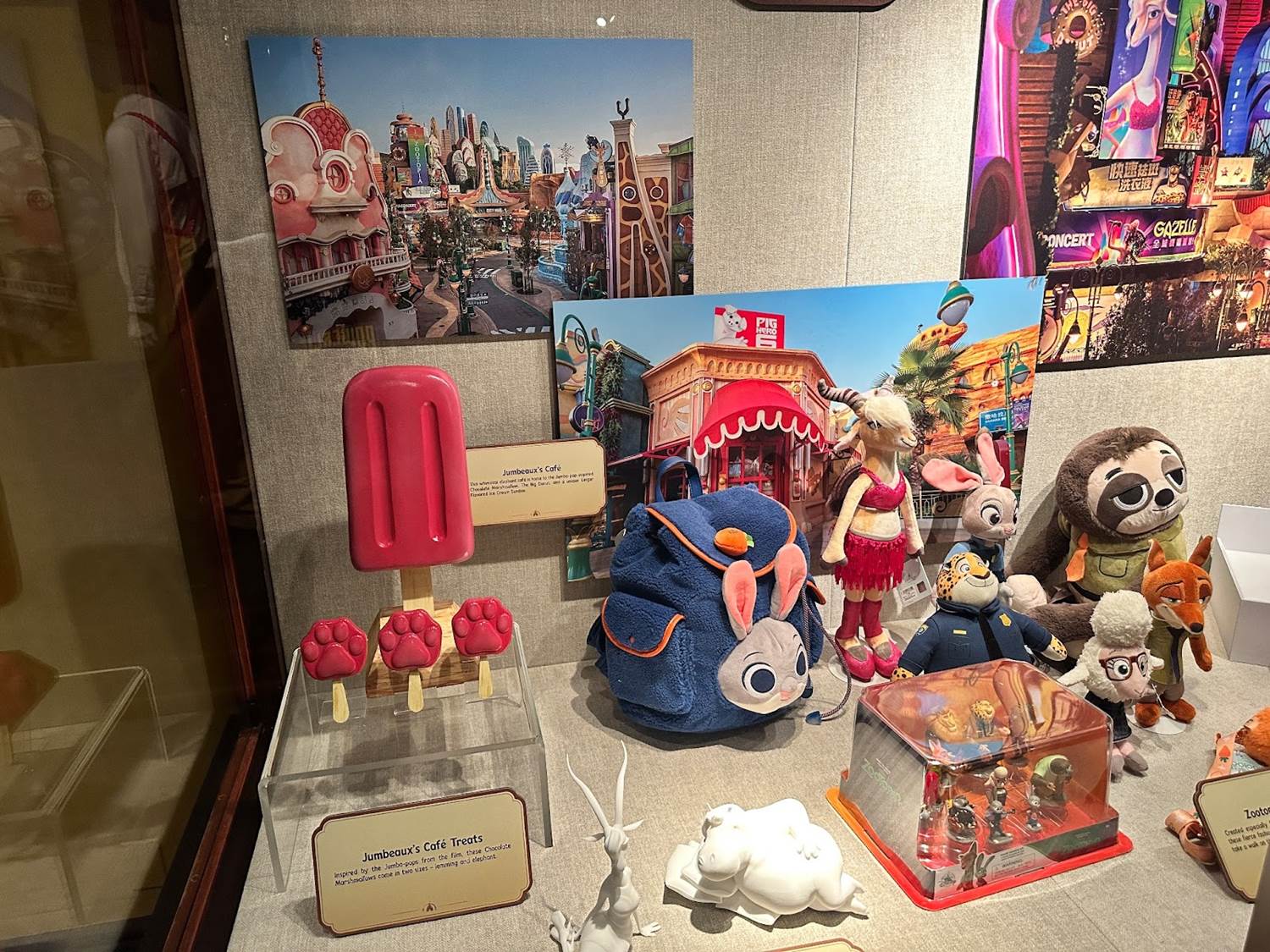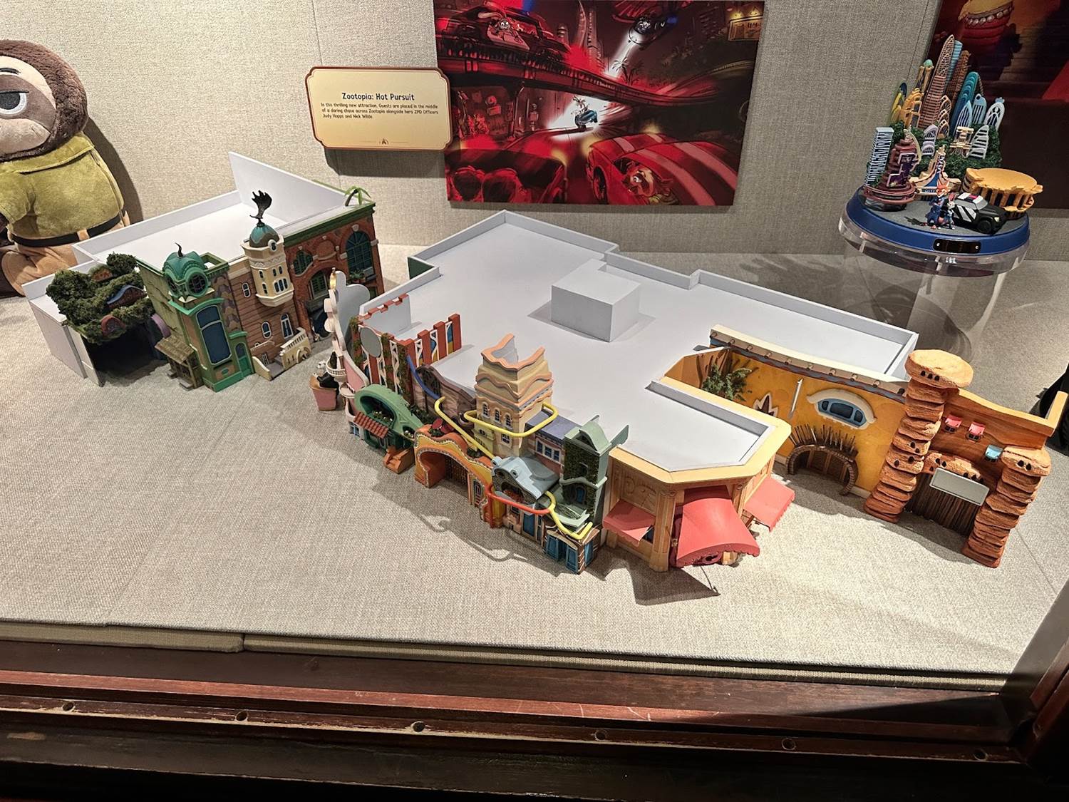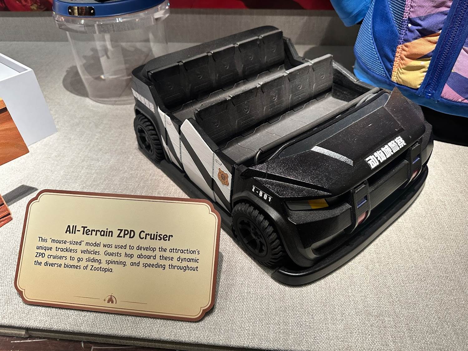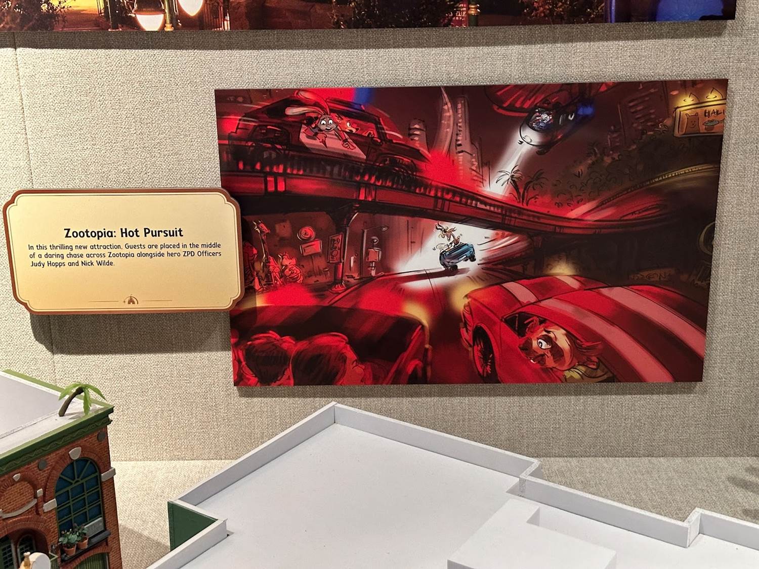 - Alongside some images from Zootopia, guests can find some merchandise items available from within the land and a maquette of the ride vehicle for Zootopia: Hot Pursuit.