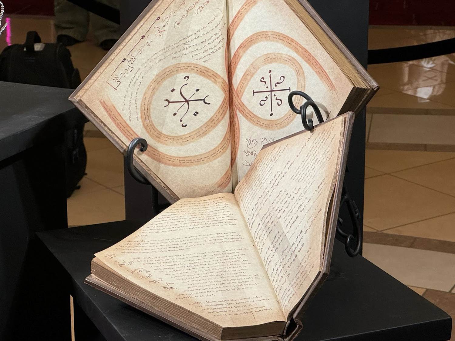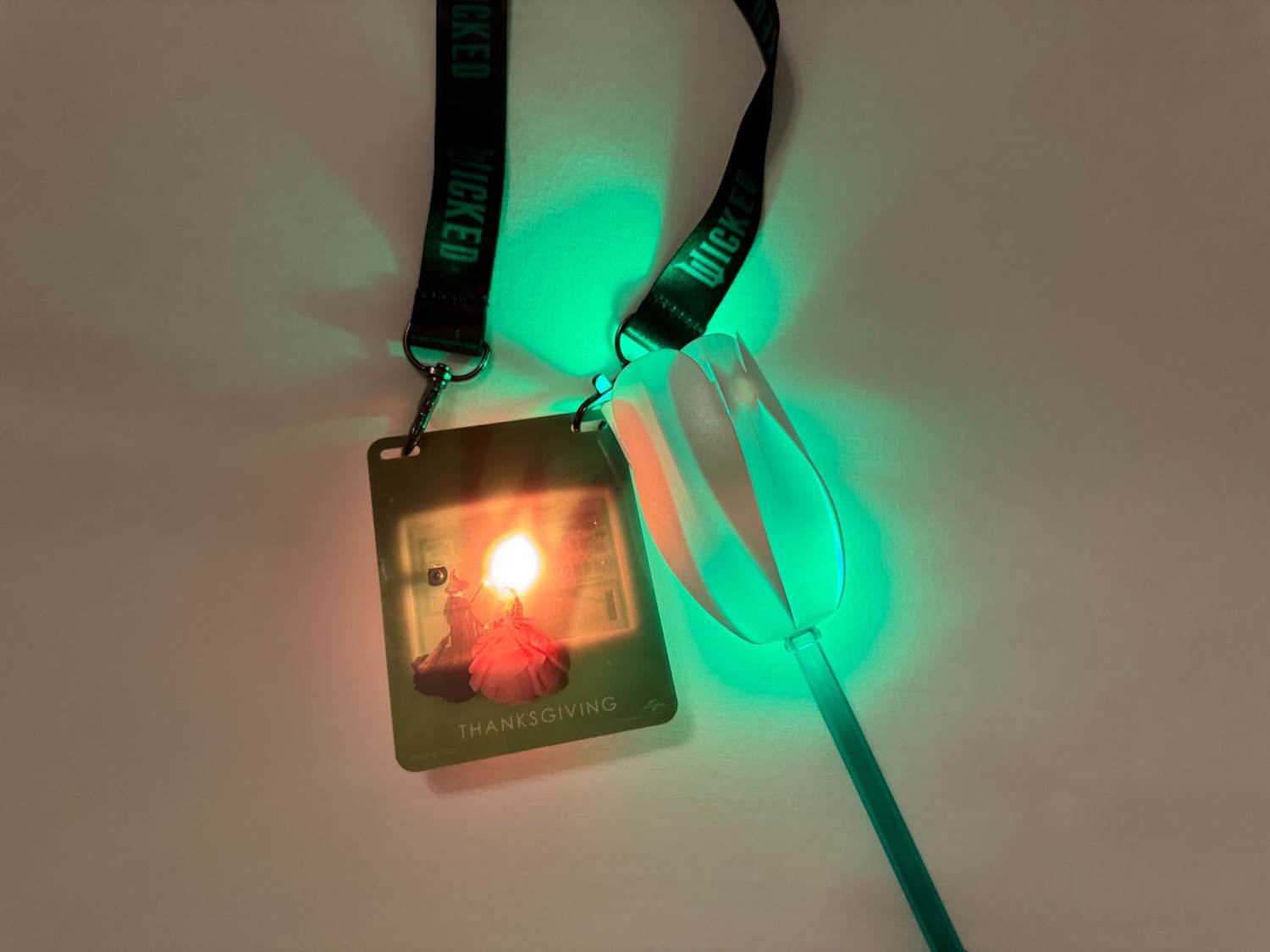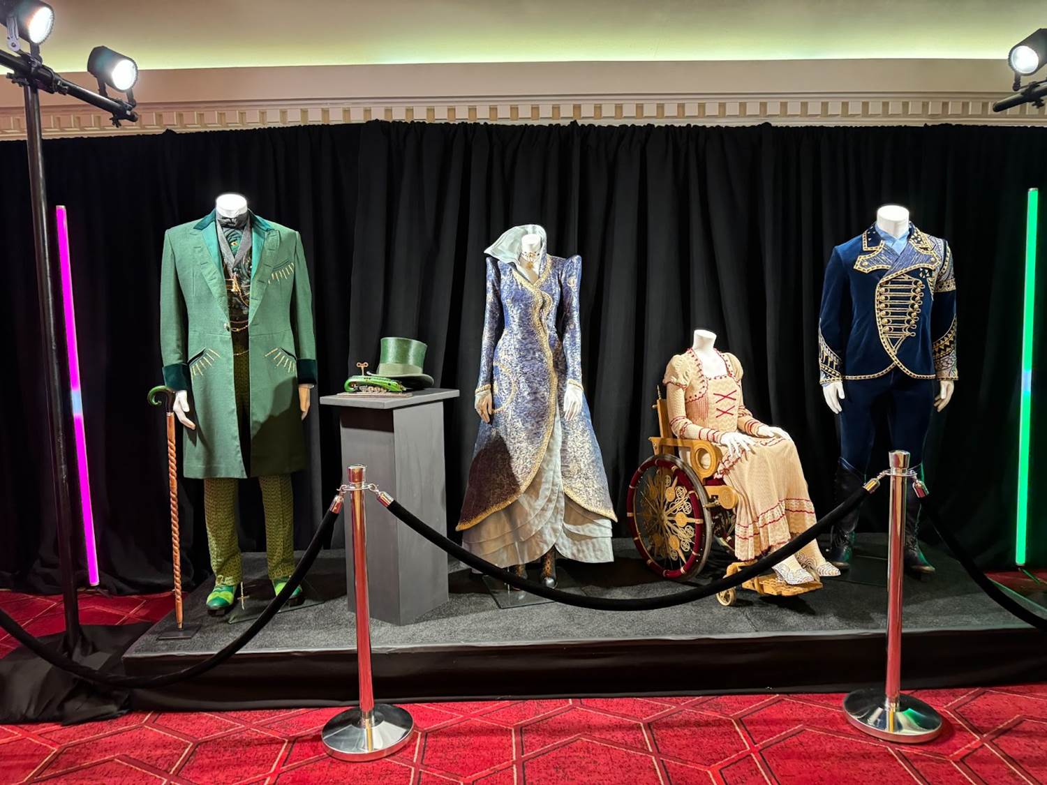 Held for the finale, but continuously teased throughout the showcase, it was finally time for a look at Wicked, Universal’s two-film adaptation of the hit Broadway musical prequel to The Wizard of Oz. When we entered the Colosseum at Caesar’s Palace, props and costumes from the film were on display. We were given a bulky lanyard to wear that would be activated at some point during the show, and cup holders in the theater contained a battery-operated tulip.