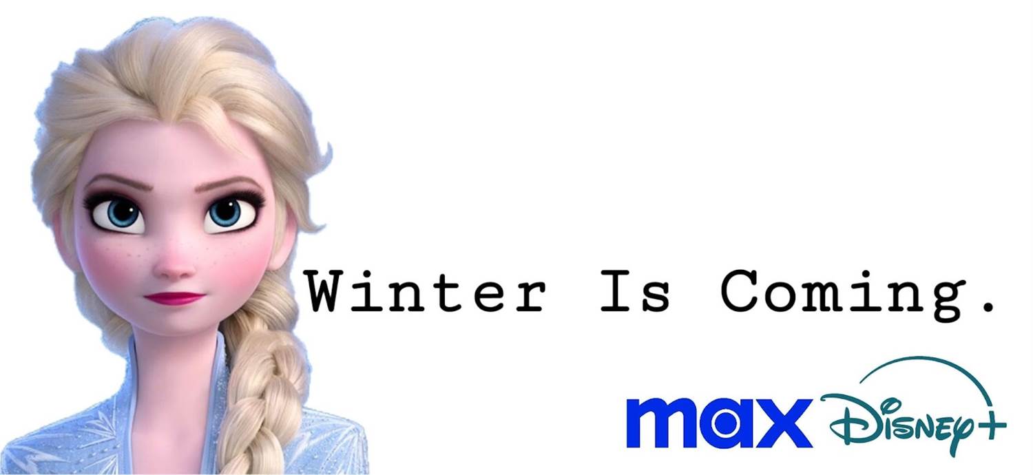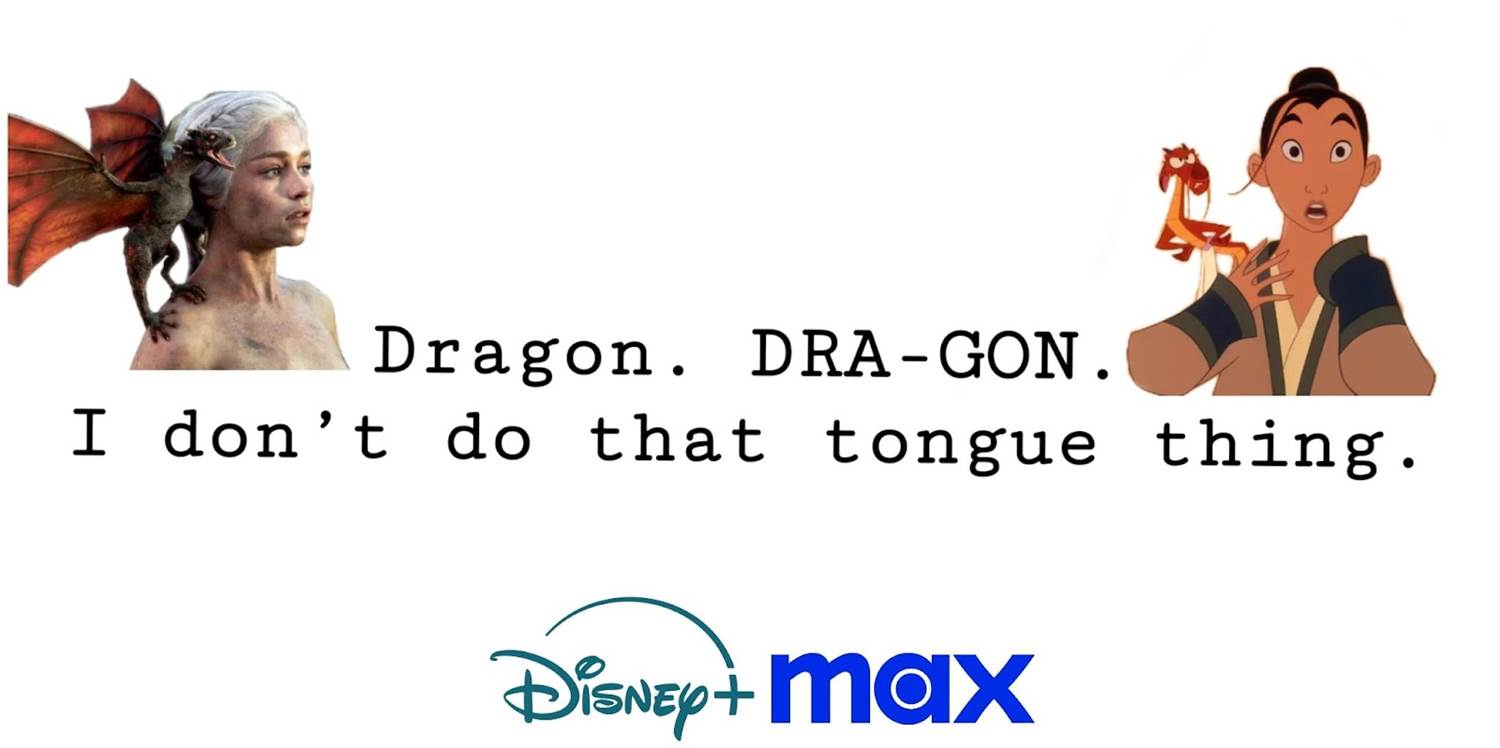 Pictured above, you find an example of this campaign as spotted at Downtown Disney at the Disneyland Resort. A quote from a Disney/Star Wars/Marvel film, mixed in with content from Hulu. Keeping this same format, we did some lazy photoshopping (read: poorly done) to create some newer ones mixing a Disney quote with HBO/Max content.