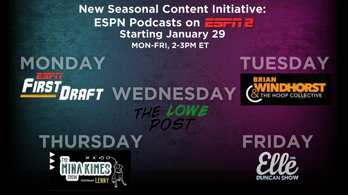 - Beginning on Monday, January 29, ESPN2 will televise an ESPN video podcast every weekday from 2-3 p.m. ET. The premiering lineup will include: First Draft, The Hoop Collective, The Lowe Post, The Mina Kimes Show and The Elle Duncan Show.