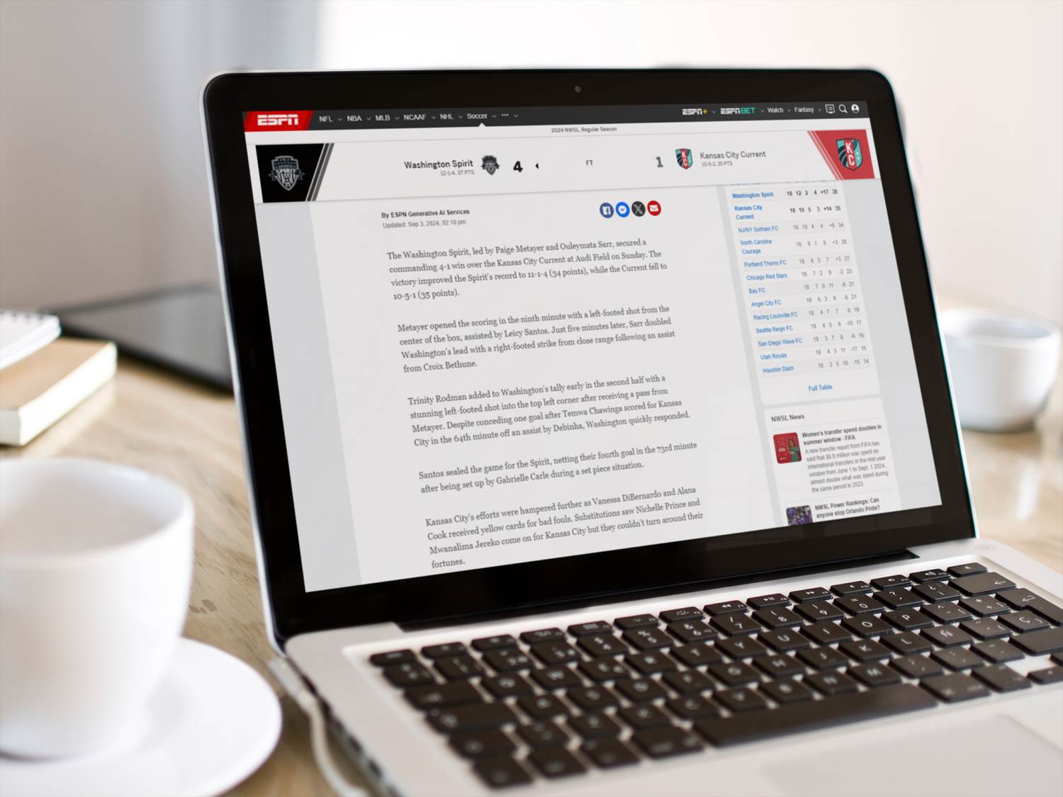 - They plan to use AI technology to produce text game recaps of select sporting events, which fans can see on ESPN digital platforms.