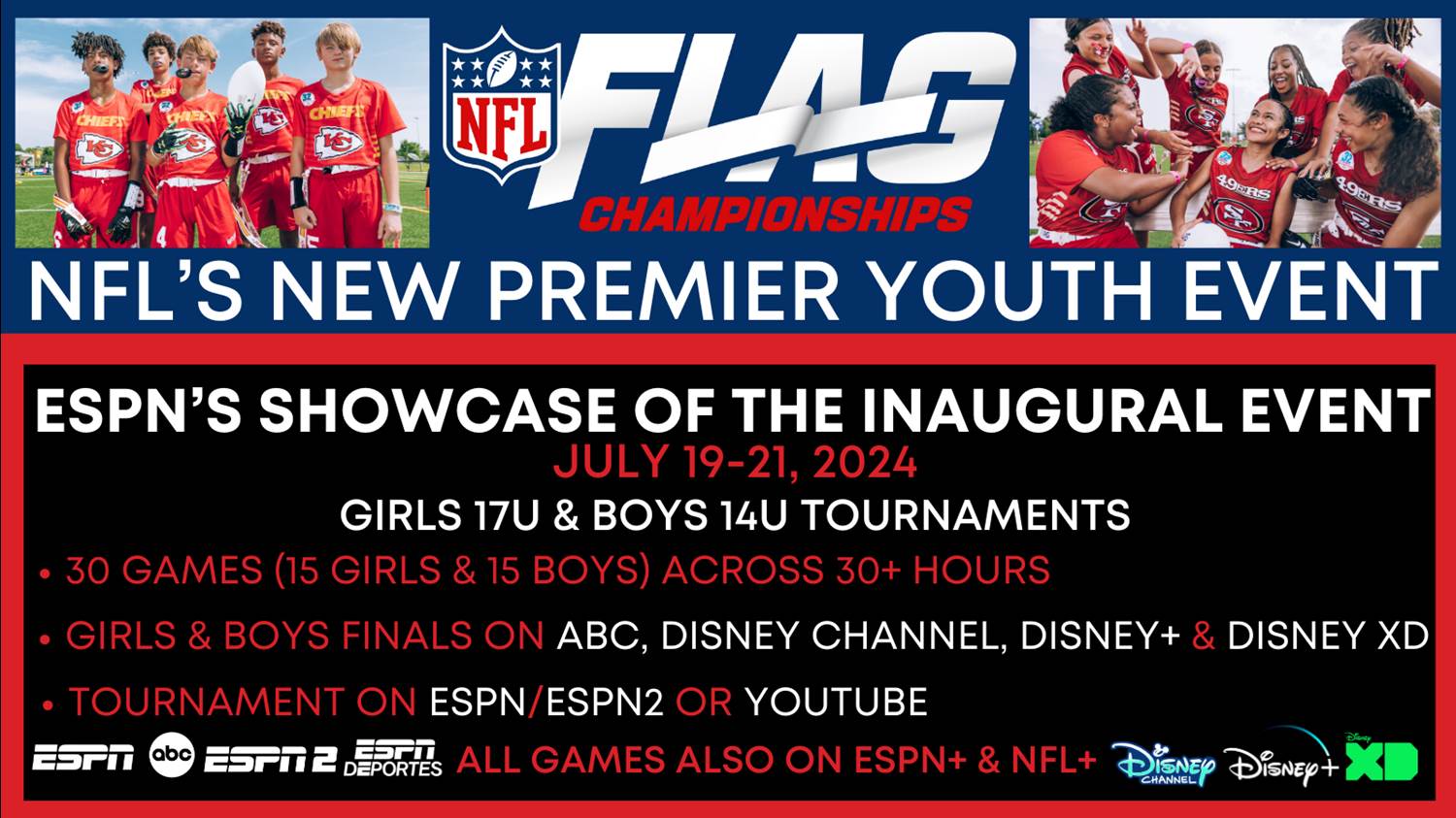 - Julie Sobieski, ESPN Senior Vice President of League Programming and Acquisitions: “The NFL Flag Championships is ESPN and Disney’s newest opportunity to support the NFL’s tremendous work around flag football. We will equally showcase the girls 17U and boys 14U tournaments across our television and streaming platforms and our branded social networks, introducing the sport to new fans. The summer tournament adds a signature event on our year-around NFL calendar and further deepens our youth-focused initiatives."