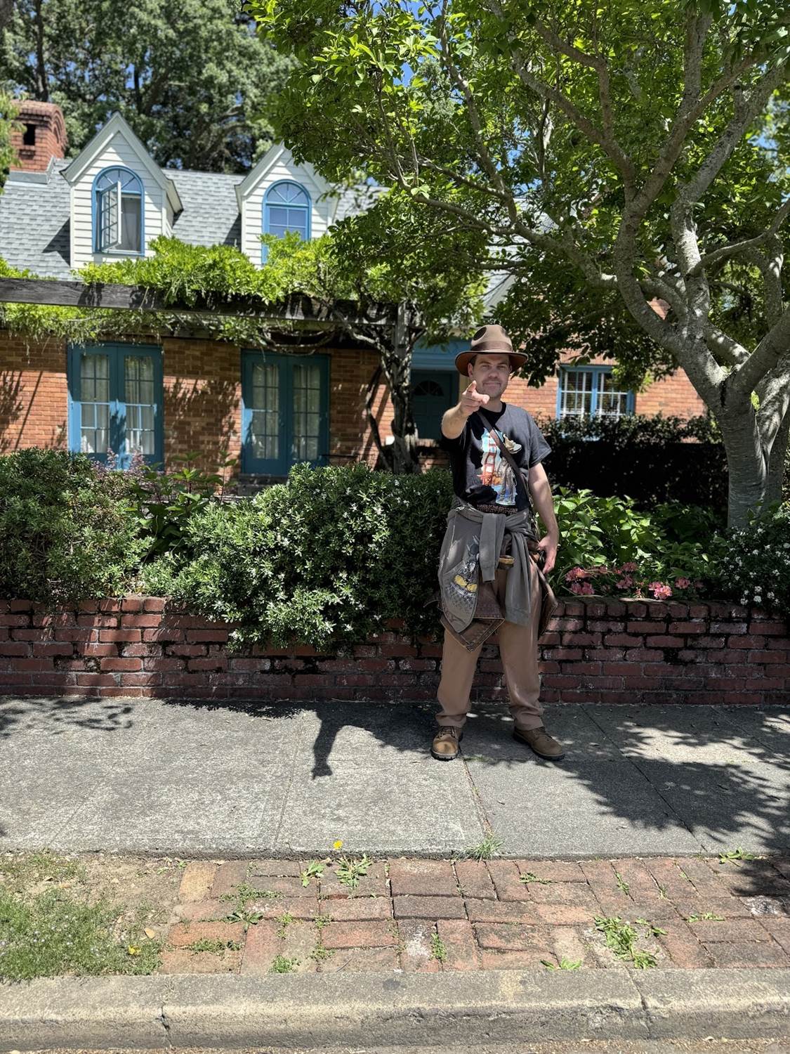 After getting photo-ops with the statue and cracking whips at the park, we explored a number of the buildings and shops from San Anselmo. This included a toy shop which had a prop from Raiders Of the Lost Ark. A local resident even noticed my costume and pointed out the location for the original Lucasfilm building where Star Wars and Indiana Jones were first written. And the parking lot where Harrison Ford first practiced cracking a whip.