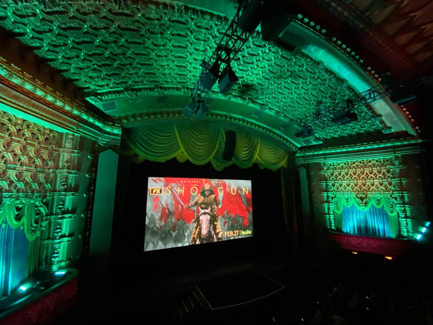 Then once we got inside the El Capitan’s auditorium itself (and before the drum performance and the arrival of the cast and married creative team) we found the Shogun billboard-style marketing projected on the big screen. Lastly it was time to sit back, relax, and enjoy the premiere episode of Shogun via El Capitan Theatre’s state-of-the-art digital projection and sound systems.