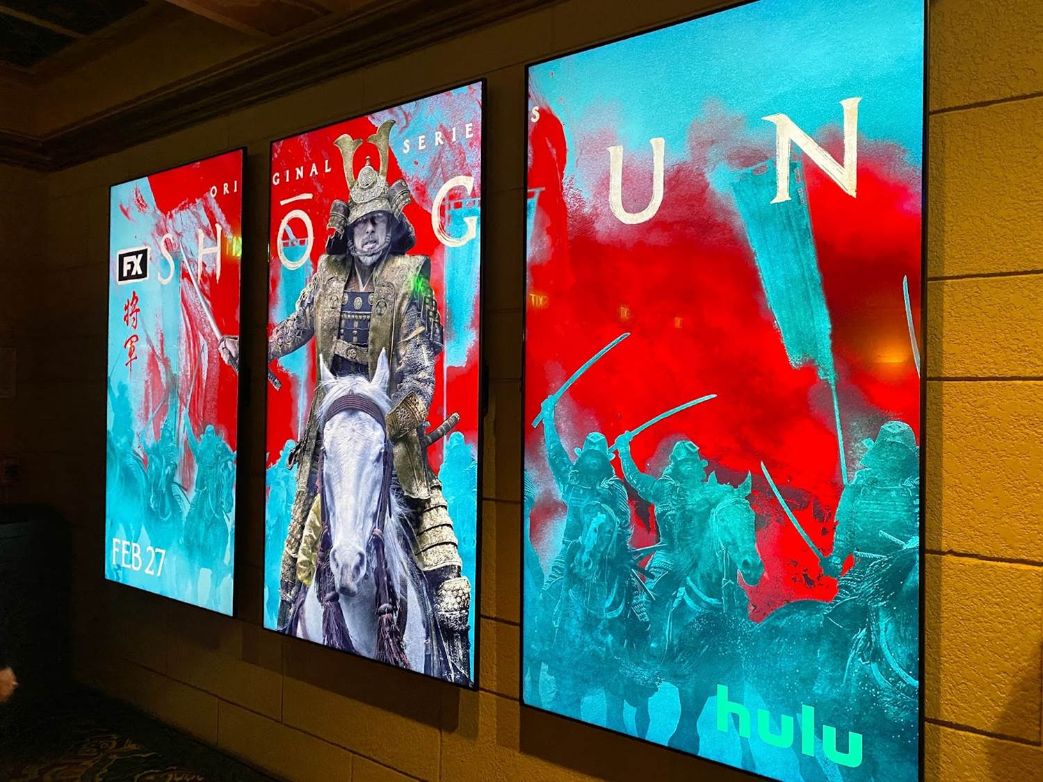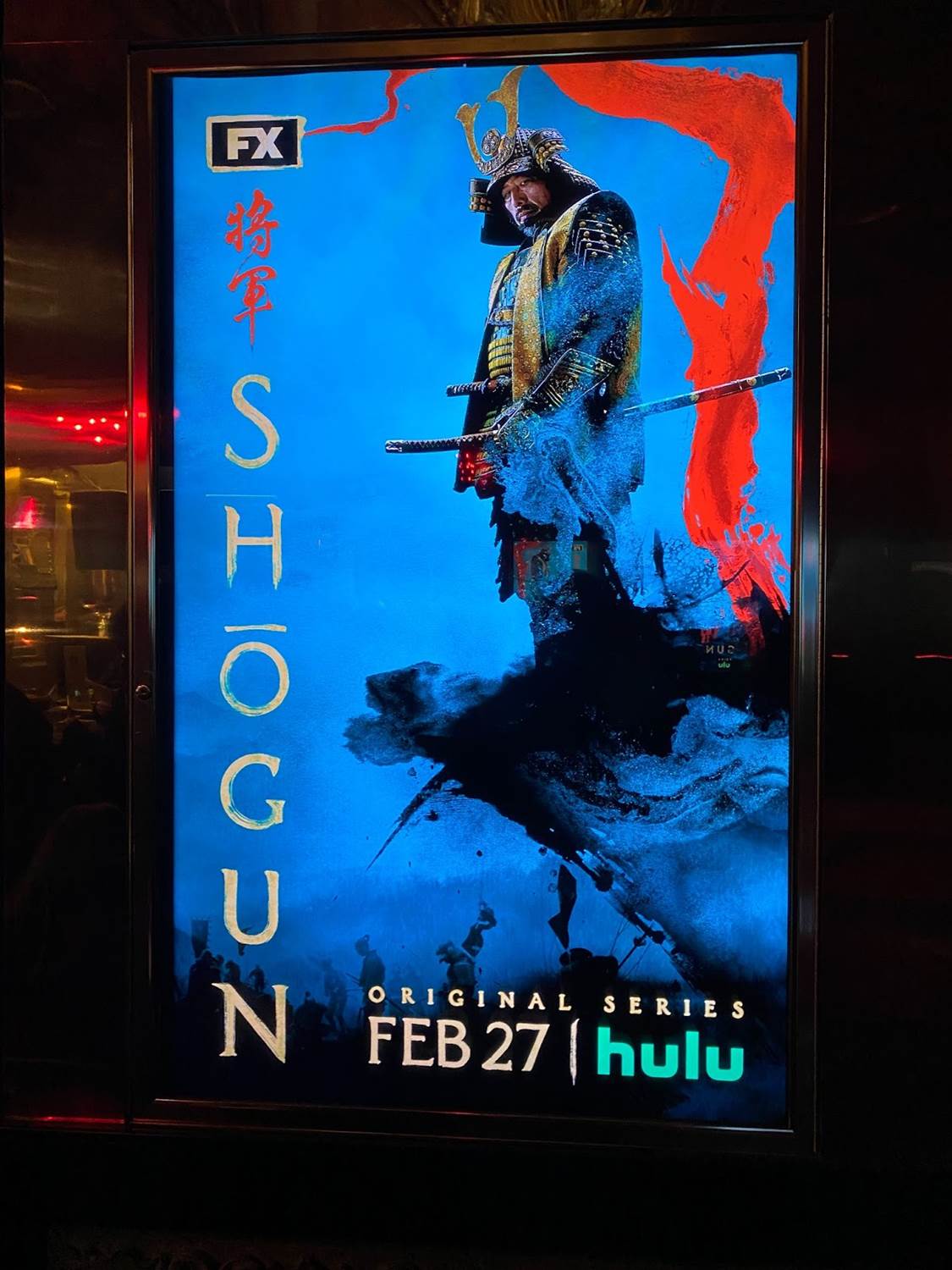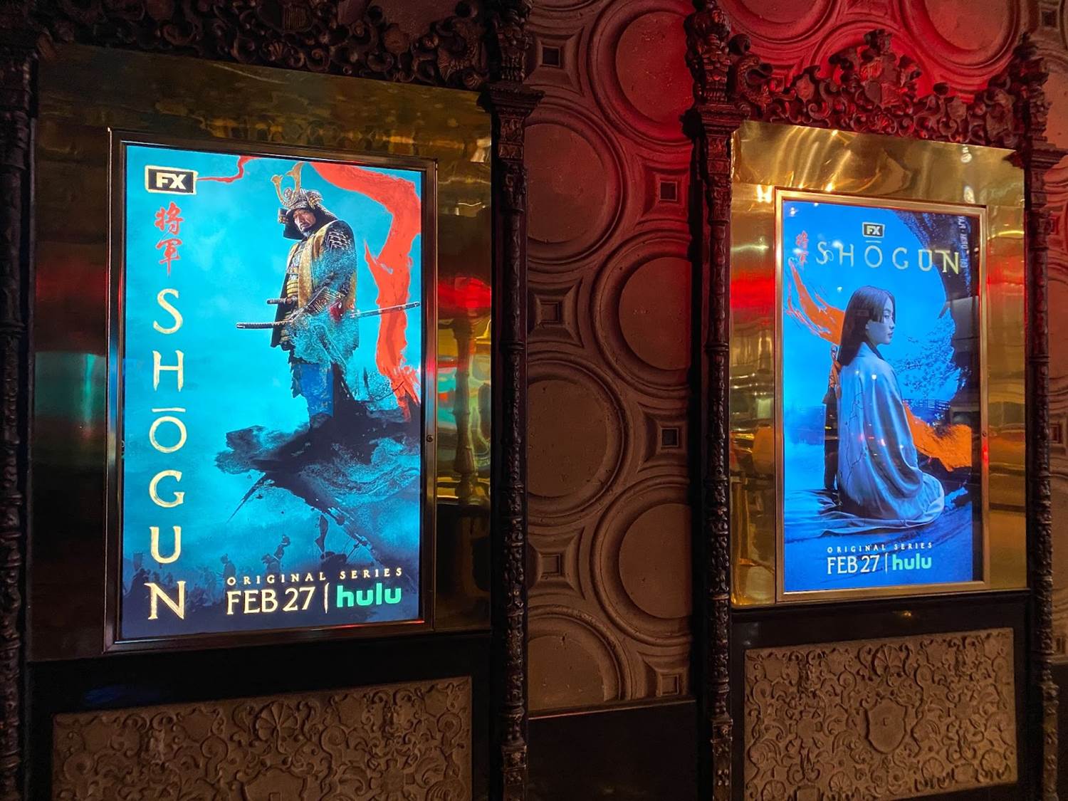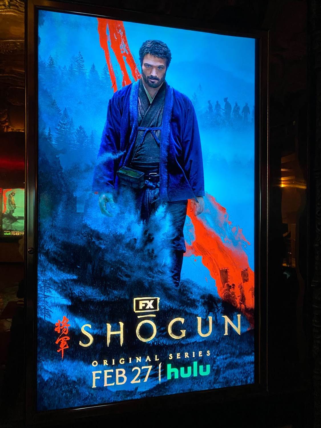 Rewinding time an hour or so, it was cool to arrive at El Capitan Theatre on Hollywood Boulevard and see the famous movie house’s marquee lit up with the Shogun key art. The interior of the theater’s lobby was decorated for the occasion with electronic posters for the miniseries as well.
