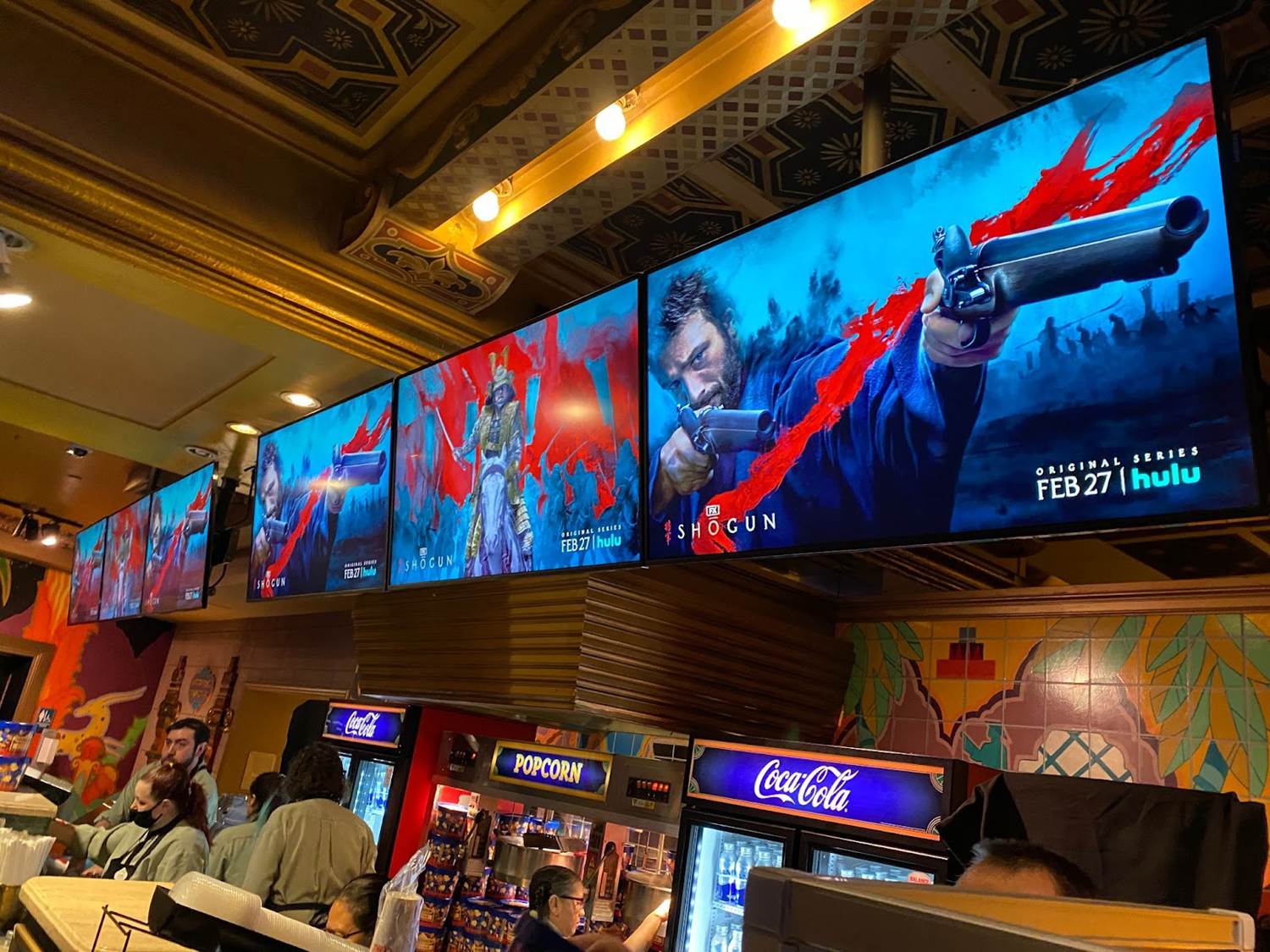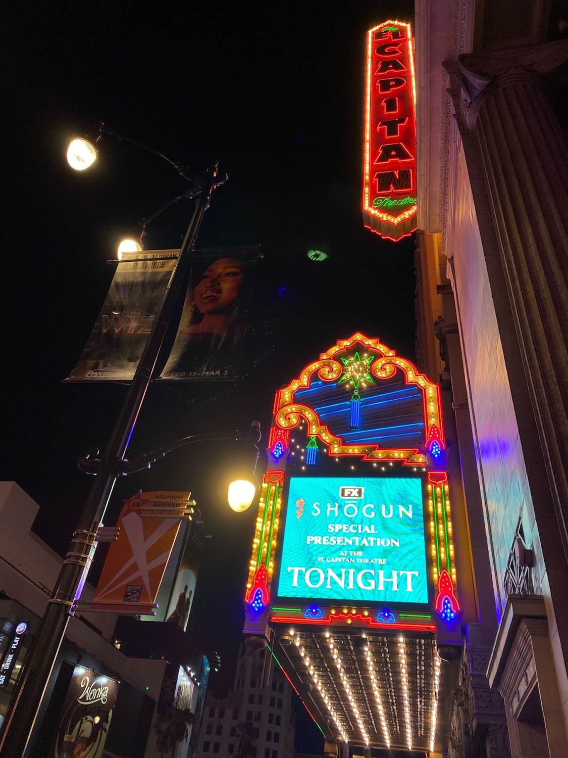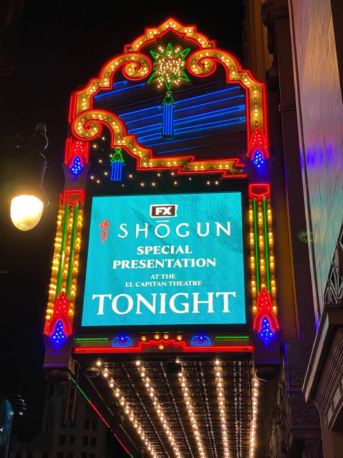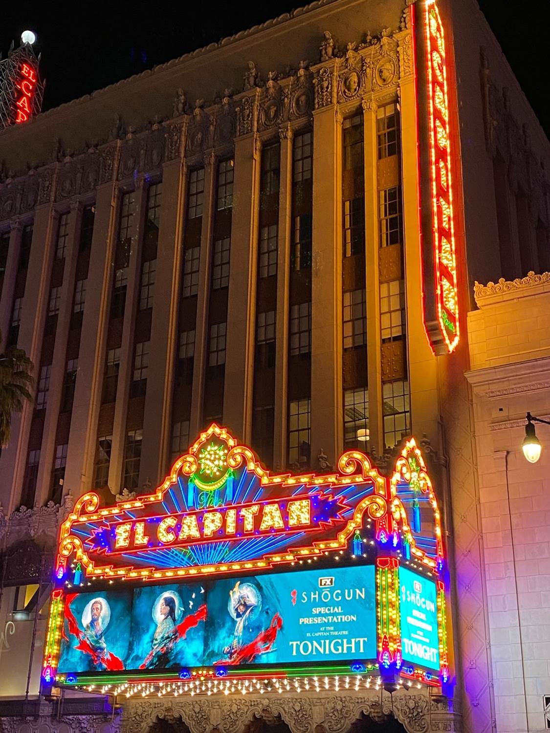 Rewinding time an hour or so, it was cool to arrive at El Capitan Theatre on Hollywood Boulevard and see the famous movie house’s marquee lit up with the Shogun key art. The interior of the theater’s lobby was decorated for the occasion with electronic posters for the miniseries as well.