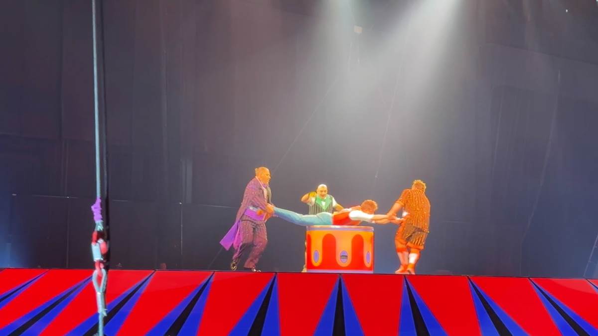 Audiences will feel like they’re attending the most colorful concert ever during “The Greatest Show on Earth." The lone ringmaster concept has been replaced by a trio of performers who serve as hosts. Aria (Lauren Irving) is the songstress, belting out tunes like the original opening number “Welcome to the Show" and delivering iconic covers of songs like “Diamonds" by Rhianna. Stix (Alex Stickels) carries the rhythm of the show as the drummer, encouraging audience participation during a “Melody Mixer" interactive moment, and also does his own stunts by playing the drums on a floating platform suspended in the air. Nick Nack (Jan Dam) is the comedic heart of the show, a jack-of-all-trades who seems to have lost control of the show’s comedy troupe (more on that soon).