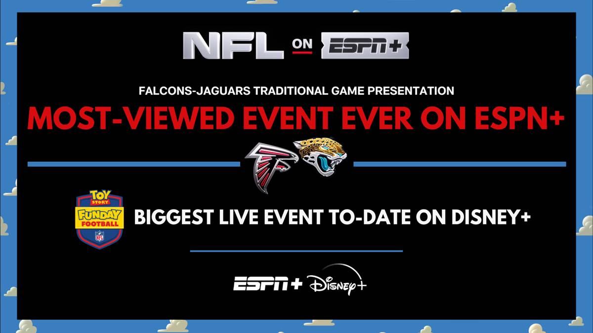 - The Falcons-Jaguars traditional game presentation was the most-viewed event ever on ESPN+, and the Toy Story Funday Football alternate presentation delivered the biggest live event to date on Disney+ (based on peak concurrency).