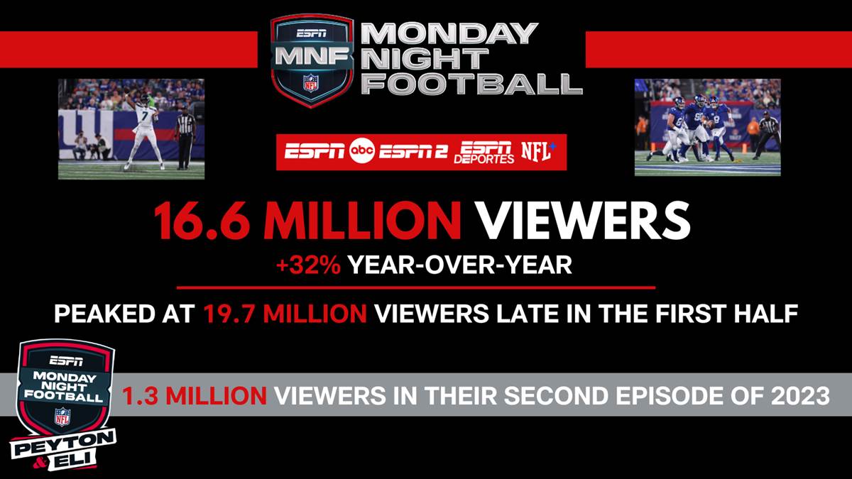 - Monday Night Football with Peyton and Eli (ESPN2) delivered 1.3 million viewers in their second episode this season.