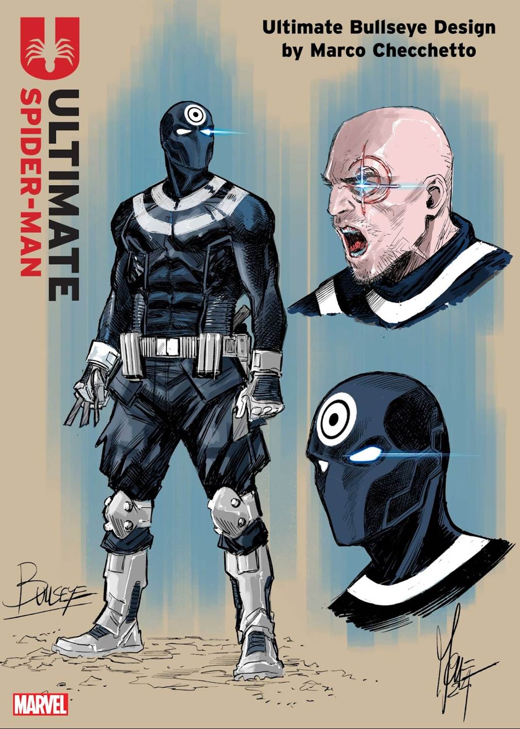- Throughout "Ultimate Spider-Man," Checchetto delivers masterful new approaches to iconic villains, and fans can check out his original design sheet for Ultimate Bullseye who will make his mark in the series starting in this month’s issue #3!