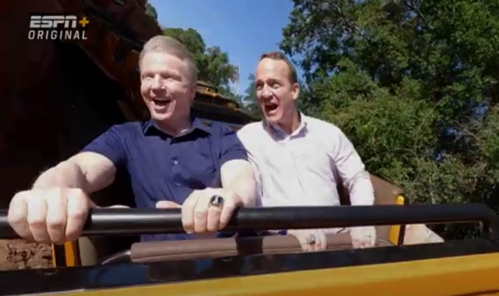 - Hall of Fame NFL quarterback Peyton Manning takes football fans to a whole new slate of historical locations, including Walt Disney World, where we see him riding Big Thunder Mountain Railroad with Phil Simms.