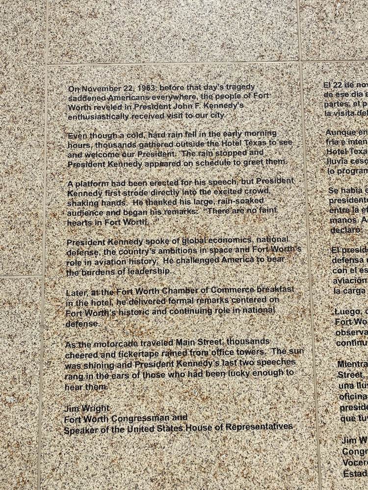 The first day of the trip was spent at the Hilton Fort Worth, which was formerly known as the Hotel Texas, and is most famously known as the building where United States President John F. Kennedy spent his final night. Outside the hotel stands a memorial JFK statue, marking the spot of his last-ever speech to the public before he headed to Dallas on that fateful day 60 years ago. I was thrilled to be able to peer down on the statue from my room, and I found it tremendously informative and inspirational to read about JFK’s speech that morning.