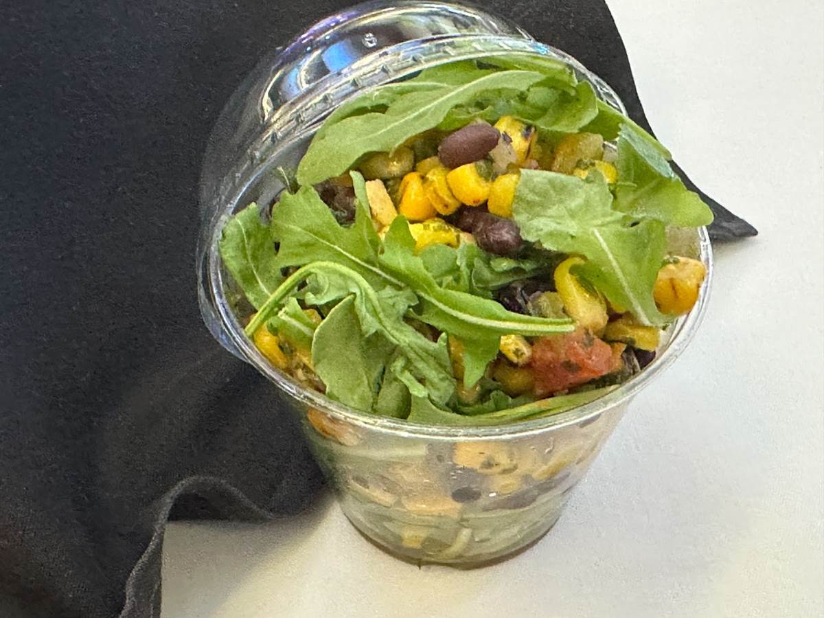 - A hand tossed arugula salad with fire-roasted peppers, onions, corn, and black beans
