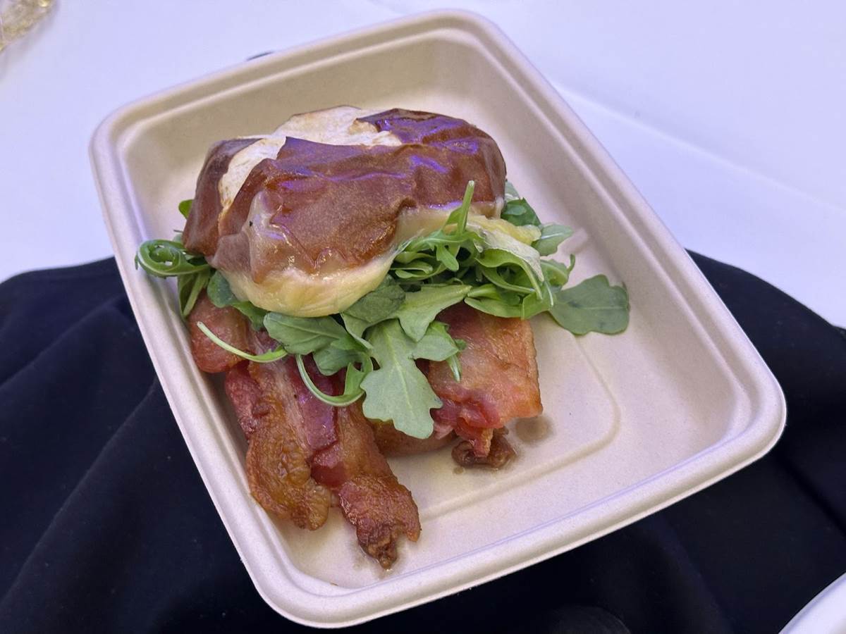 - Applewood bacon, gouda and arugula sandwich on a pretzel bun