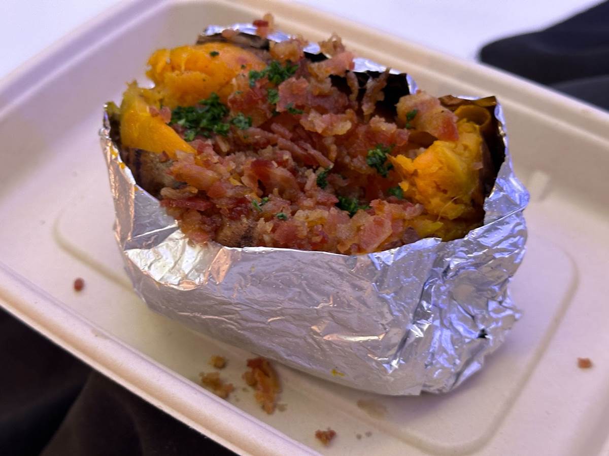 - Loaded sweet potato topped with maple cinnamon butter and Applewood bacon