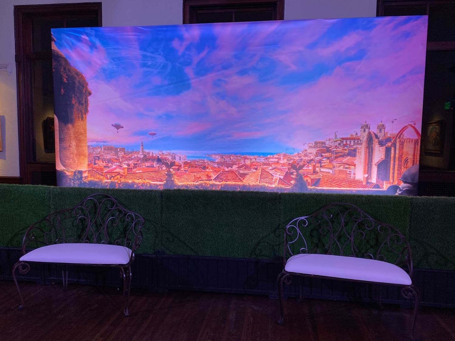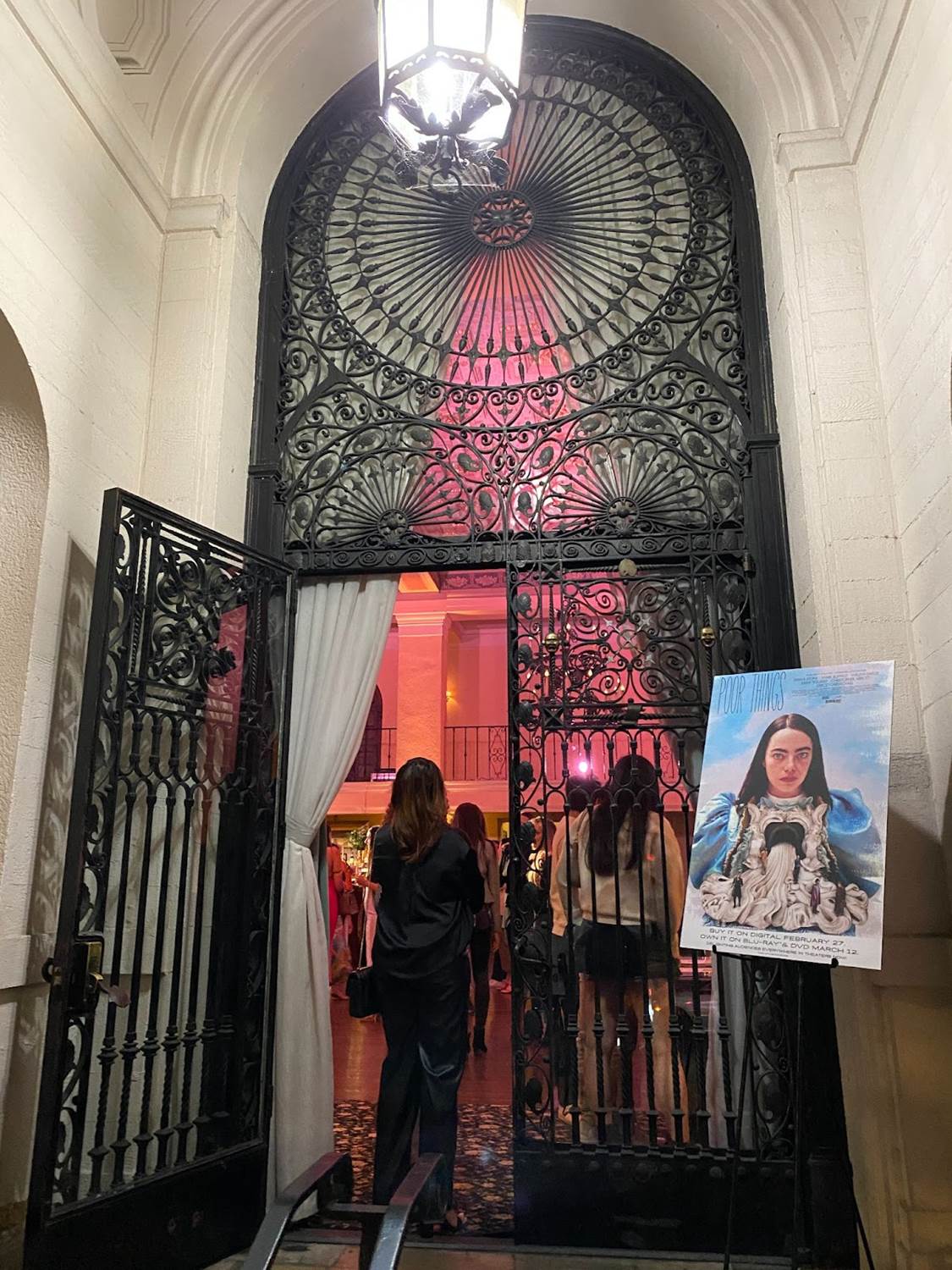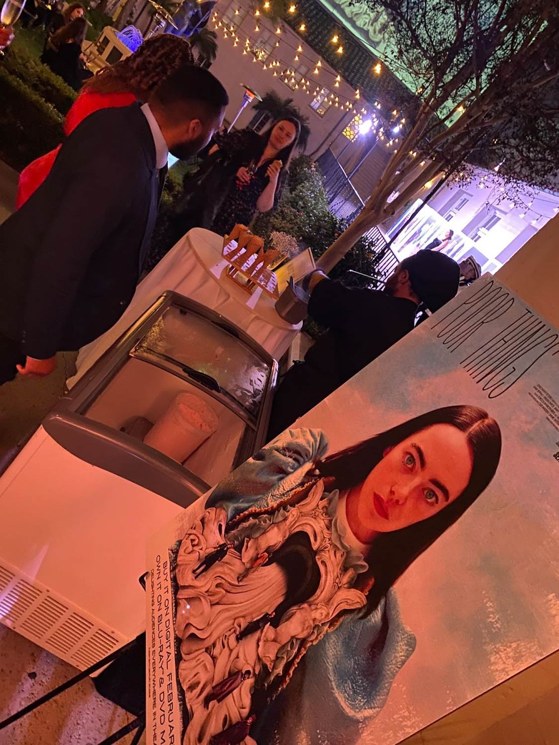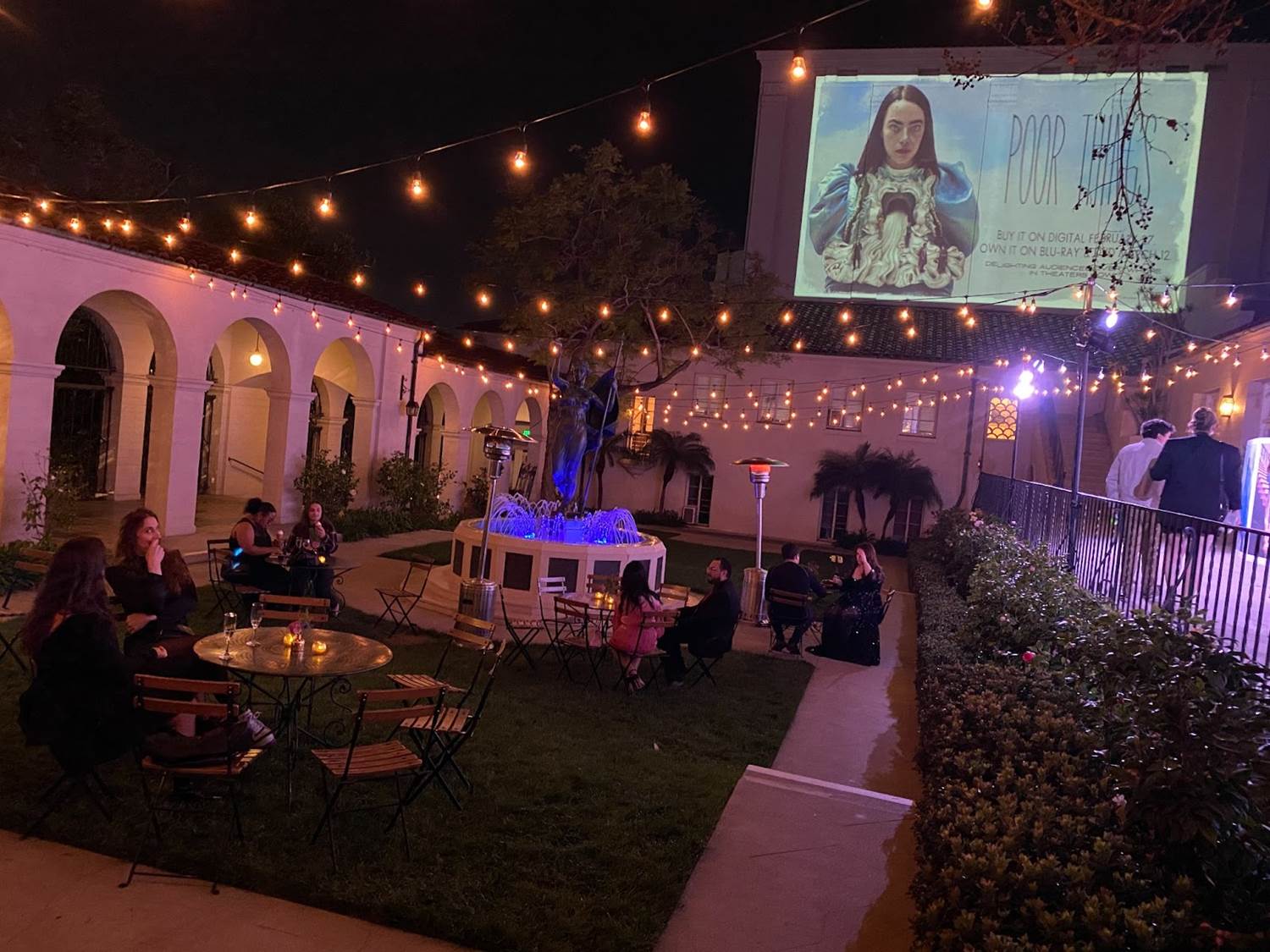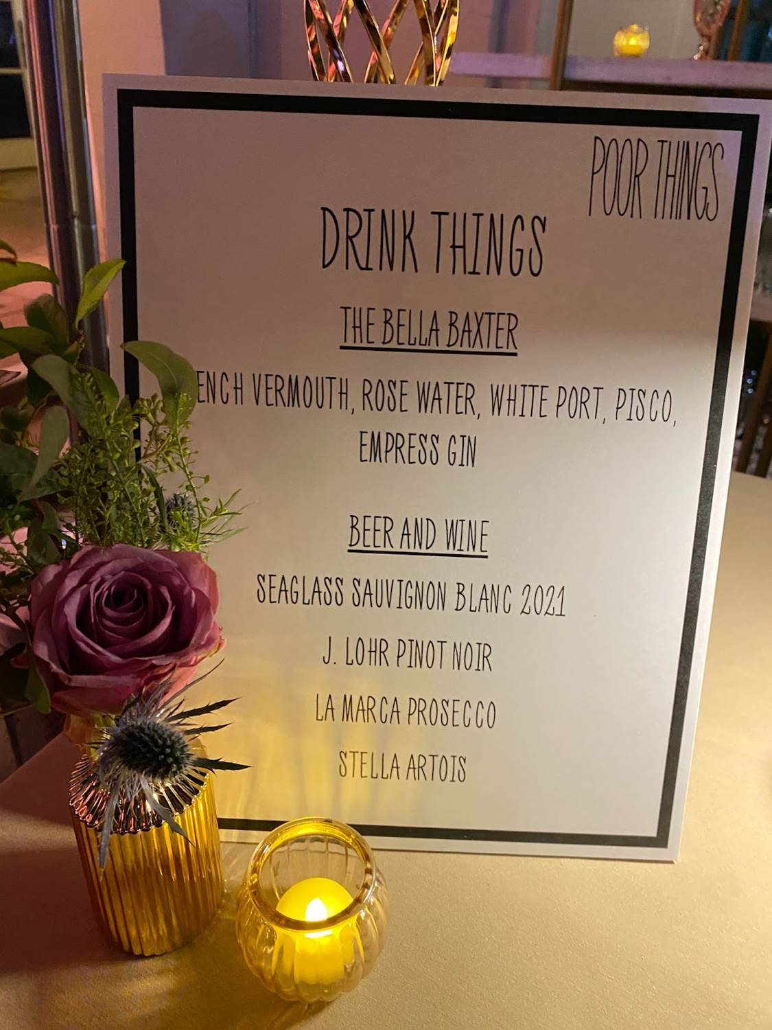 Outside in the extremely pleasant and relaxing courtyard area, there was a big projected image of the Poor Things billboard, plus a giant fold-out photo opportunity showing off more of the amazing costumes from the movie. Plus, bartenders served a variety of beer and wine, along with a special signature cocktail themed to Bella Baxter herself.