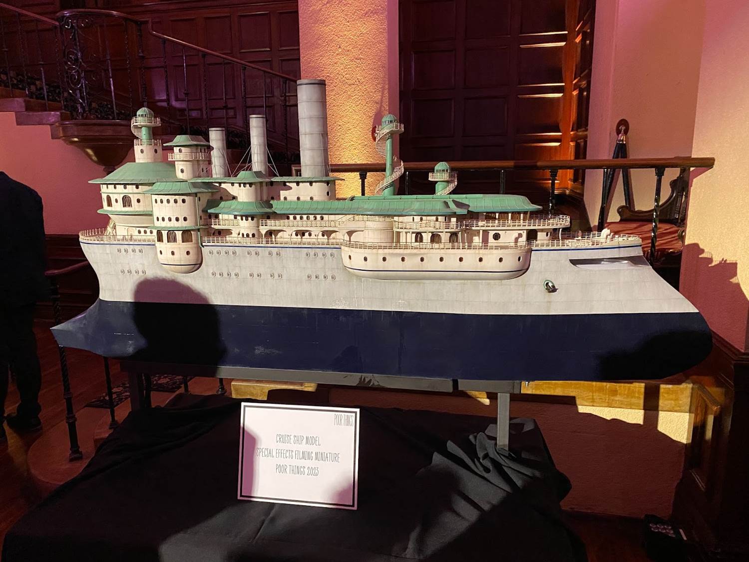 Rewinding time a little bit, when we arrived at the extremely nice venue (Ebell of Los Angeles) we found Poor Things signage pointing us in the right direction. And after checking in, there was also an extremely cool ship miniature used in the making of the film.l