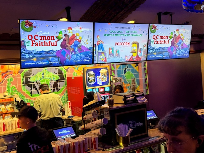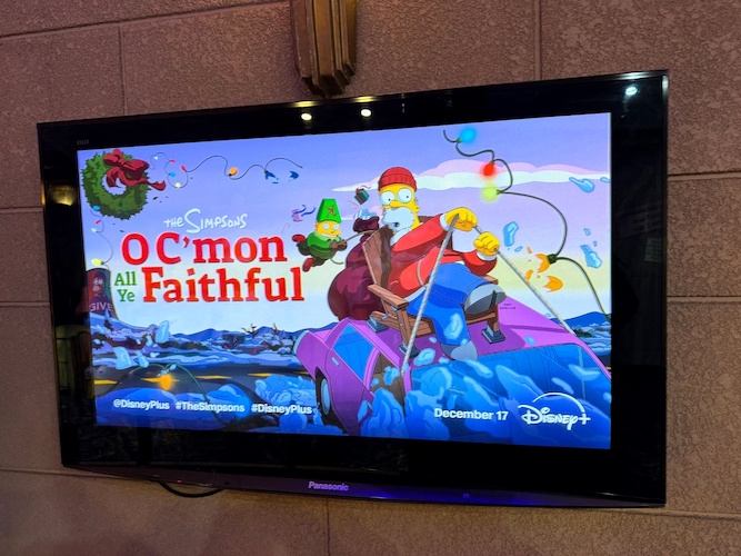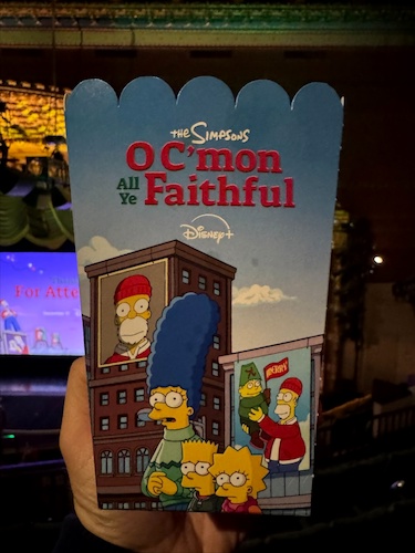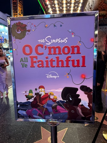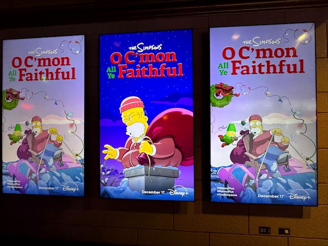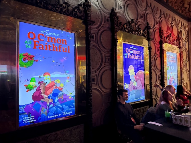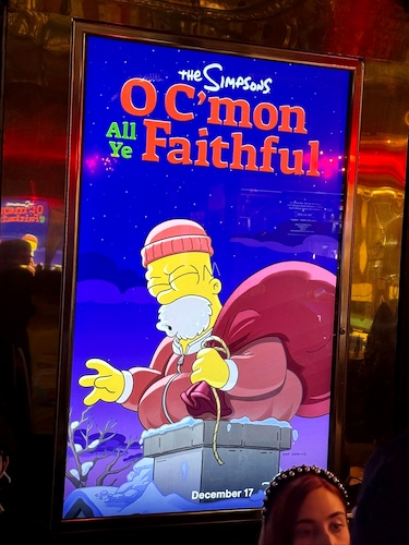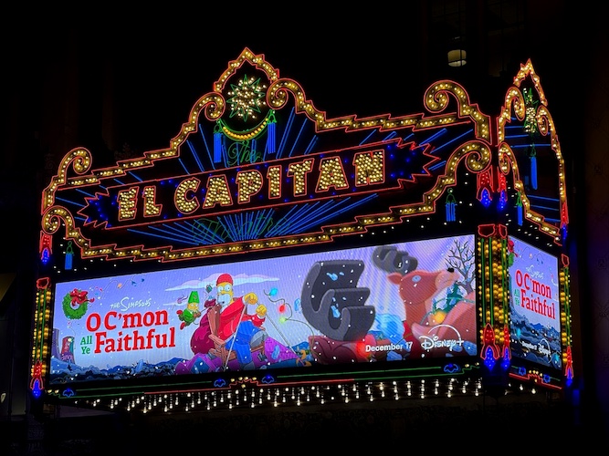 Rewinding time about an hour, we arrived at El Capitan Theatre to find the Hollywood movie house’s marquee decked out in the key art for The Simpsons “O C’mon All Ye Faithful" holiday special. Electronic posters for the special also lined the vestibule entrance to the theater.