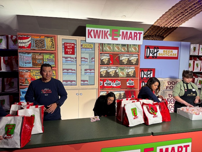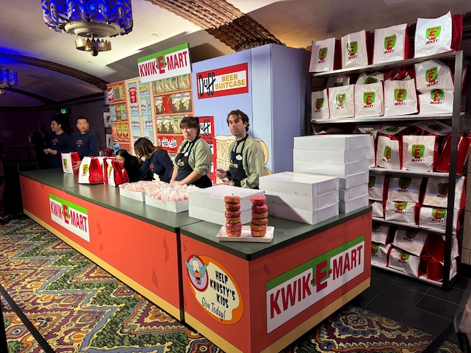 Inside the El Capitan, the concession stands also had “O C’mon All Ye Faithful" displays, as guests were distributed complimentary popcorn and beverages. Then we were ushered through a The Simpsons couch photo op (see top image) and a Kwik-E-Mart booth setup where goodie bags were given out to the attendees.