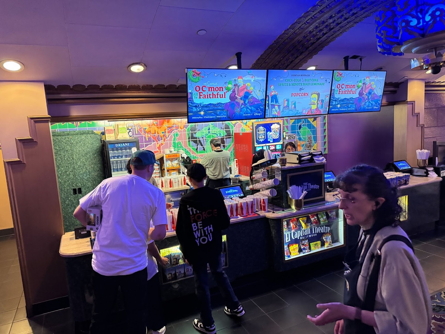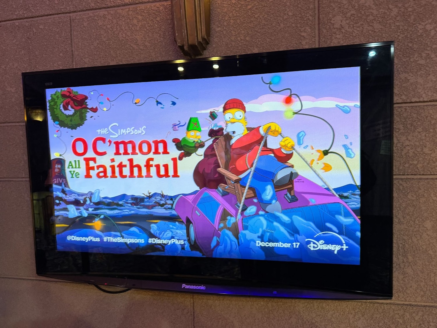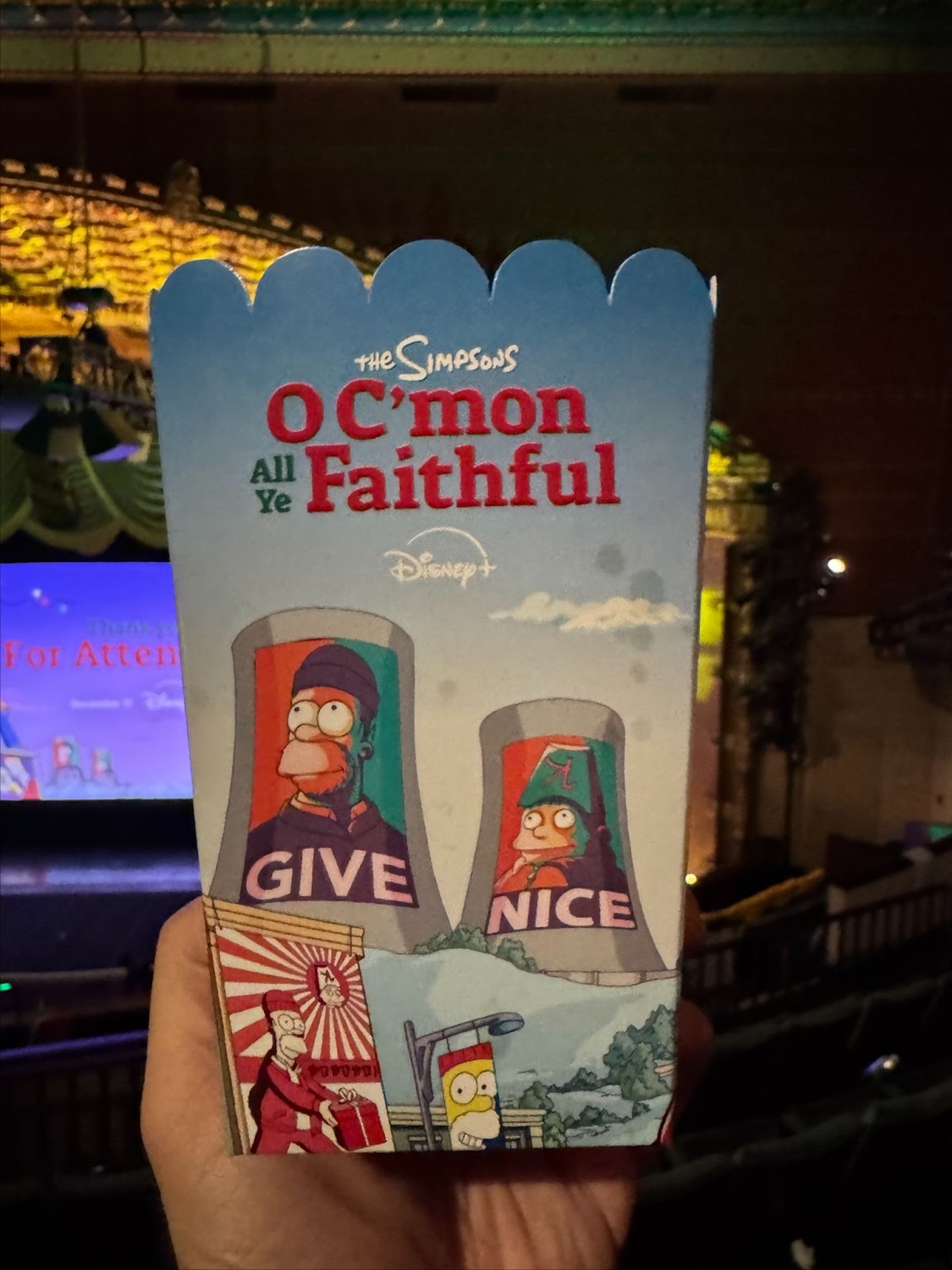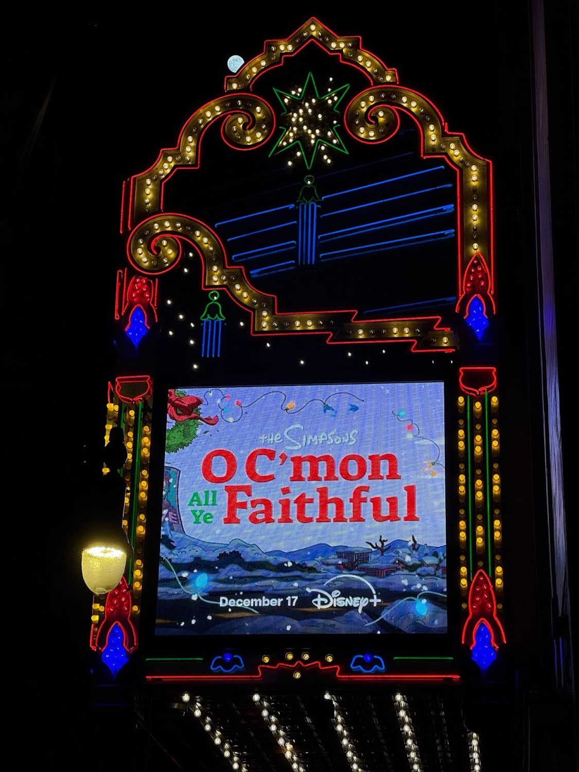 Rewinding time about an hour, we arrived at El Capitan Theatre to find the Hollywood movie house’s marquee decked out in the key art for The Simpsons “O C’mon All Ye Faithful" holiday special. Electronic posters for the special also lined the vestibule entrance to the theater.